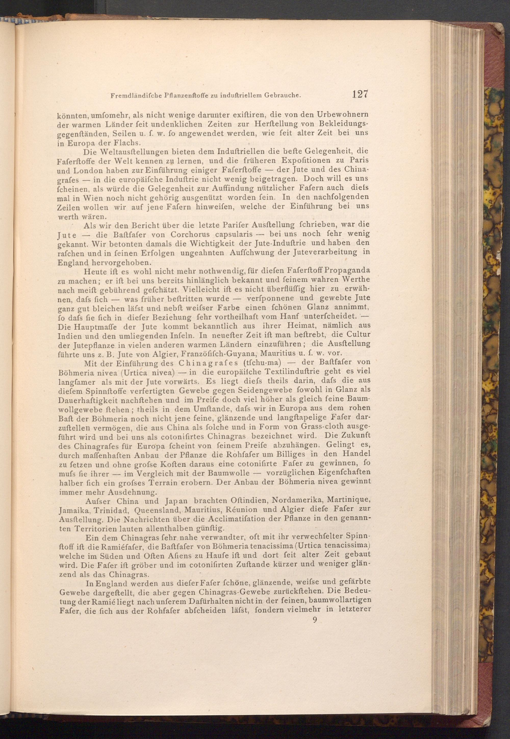 Aufser China und Japan brachten Oftindien, Nordamerika, Martinique, Jamaika, Trinidad, Queensland, Mauritius, Réunion und Algier diefe Fafer zur Ausftellung. Die Nachrichten über die Acclimatisation der Pflanze in den genannten Territorien lauten allenthalben günftig.