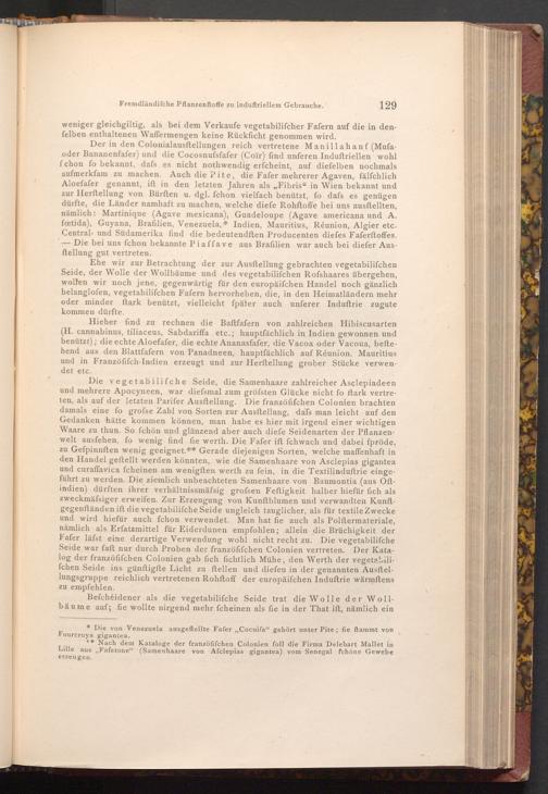 Die vegetabilifche Seide, die Samenhaare zahlreicher Asclepiadeen und mehrere Apocyneen, war diefsmal zum gröfsten Glücke nicht fo stark vertreten, als auf der letzten Parifer Ausftellung. Die franzöfifchen Colonien brachten damals eine fo grofse Zahl von Sorten zur Ausftellung, dafs man leicht auf den Gedanken hätte kommen können, man habe es hier mit irgend einer wichtigen Waare zu thun. So fchön und glänzend aber auch diefe Seidenarten der Pflanzenwelt ausfehen, fo wenig find fie werth. Die Fafer ift fchwach und dabei fpröde, zu Gefpinnften wenig geeignet.** Gerade diejenigen Sorten, welche maffenhaft in den Handel geftellt werden könnten, wie die Samenhaare von Asclepias gigantea und curaffavica fcheinen am wenigften werth zu fein, in die Textilinduftrie eingeführt zu werden. Die ziemlich unbeachteten Samenhaare von Baumontia( aus Oftindien) dürften ihrer verhältnissmäfsig grofsen Feftigkeit halber hiefür fich als zweckmäfsiger erweifen. Zur Erzeugung von Kunftblumen und verwandten Kunftgegenständen ift die vegetabilifche Seide ungleich tauglicher, als für textile Zwecke und wird hiefür auch fchon verwendet. Man hat fie auch als Polftermateriale, nämlich als Erfatzmittel für Eiderdunen empfohlen; allein die Brüchigkeit der Fafer läfst eine derartige Verwendung wohl nicht recht zu. Die vegetabilifche Seide war faft nur durch Proben der franzöfifchen Colonien vertreten. Der Katalog der franzöfifchen Colonien gab fich fichtlich Mühe, den Werth der vegetabilifchen Seide ins günftigfte Licht zu ftellen und diefen in der genannten Ausftellungsgruppe reichlich vertretenen Rohftoff der europäifchen Induftrie wärmftens zu empfehlen.