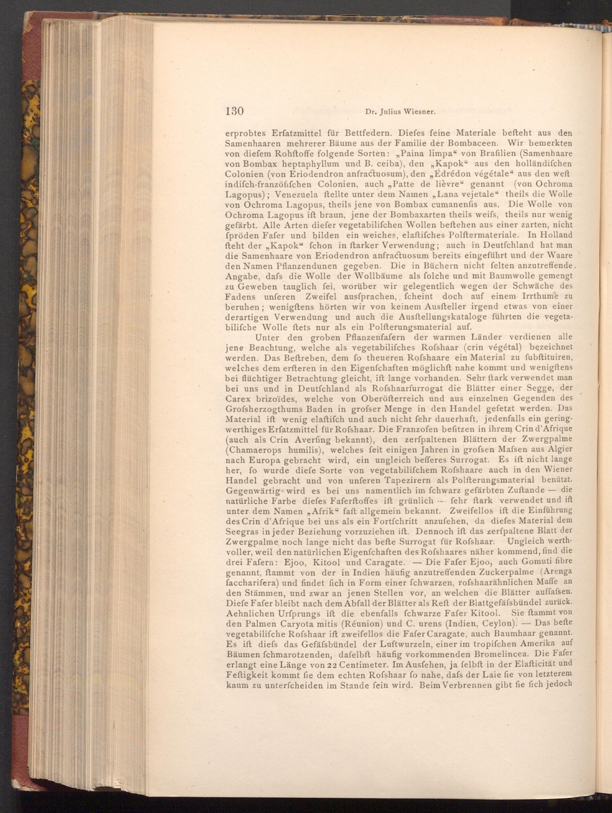 Unter den groben Pflanzenfafern der warmen Länder verdienen alle jene Beachtung, welche als vegetabilifches Rofshaar( crin végétal) bezeichnet werden. Das Beftreben, dem fo theueren Rofshaare ein Material zu fubftituiren, welches dem erfteren in den Eigenfchaften möglichft nahe kommt und wenigftens bei flüchtiger Betrachtung gleicht, ift lange vorhanden. Sehr stark verwendet man bei uns und in Deutfchland als Rofshaarfurrogat die Blätter einer Segge, der Carex brizoïdes, welche von Oberöfterreich und aus einzelnen Gegenden des Grofsherzogthums Baden in grofser Menge in den Handel gefetzt werden. Das Material ift wenig elaftifch und auch nicht fehr dauerhaft, jedenfalls ein geringwerthiges Erfatzmittel für Rofshaar. Die Franzofen befitzen in ihrem Crin d'Afrique ( auch als Crin Averfing bekannt), den zerfpaltenen Blättern der Zwergpalme ( Chamaerops humilis), welches feit einigen Jahren in grofsen Mafsen aus Algier nach Europa gebracht wird, ein ungleich befferes Surrogat. Es iſt nicht lange her, fo wurde diefe Sorte von vegetabilifchem Rofshaare auch in den Wiener Handel gebracht und von unferen Tapezirern als Polfterungsmaterial benützt. Gegenwärtig wird es bei uns namentlich im fchwarz gefärbten Zuftande-- die natürliche Farbe diefes Faferftoffes ift grünlich fehr ftark verwendet und ift unter dem Namen„ Afrik" faft allgemein bekannt. Zweifellos ift die Einführung des Crin d'Afrique bei uns als ein Fortfchritt anzufehen, da diefes Material dem Seegras in jeder Beziehung vorzuziehen ift. Dennoch ift das zerfpaltene Blatt der Zwergpalme noch lange nicht das befte Surrogat für Rofshaar. Ungleich werthvoller, weil den natürlichen Eigenfchaften des Rofshaares näher kommend, find die drei Fafern: Ejoo, Kitool und Caragate.- Die Fafer Ejoo, auch Gomuti fibre genannt, ftammt von der in Indien häufig anzutreffenden Zuckerpalme( Arenga faccharifera) und findet fich in Form einer fchwarzen, rofshaarähnlichen Maffe an den Stämmen, und zwar an jenen Stellen vor, an welchen die Blätter auffassen. Diefe Fafer bleibt nach dem Abfall der Blätter als Reft der Blattgefäfsbündel zurück. Aehnlichen Urfprungs ift die ebenfalls fchwarze Fafer Kitool. Sie ftammt von den Palmen Caryota mitis( Réunion) und C. urens( Indien, Ceylon).- Das befte vegetabilifche Rofshaar ift zweifellos die Fafer Caragate, auch Baumhaar genannt. Es iſt diefs das Gefäfsbündel der Luftwurzeln, einer im tropifchen Amerika auf Bäumen fchmarotzenden, dafelbft häufig vorkommenden Bromelincea. Die Fafer erlangt eine Länge von 22 Centimeter. Im Ausfehen, ja felbft in der Elafticität und Feftigkeit kommt fie dem echten Rofshaar fo nahe, dafs der Laie fie von letzterem kaum zu unterfcheiden im Stande fein wird. Beim Verbrennen gibt fie fich jedoch
