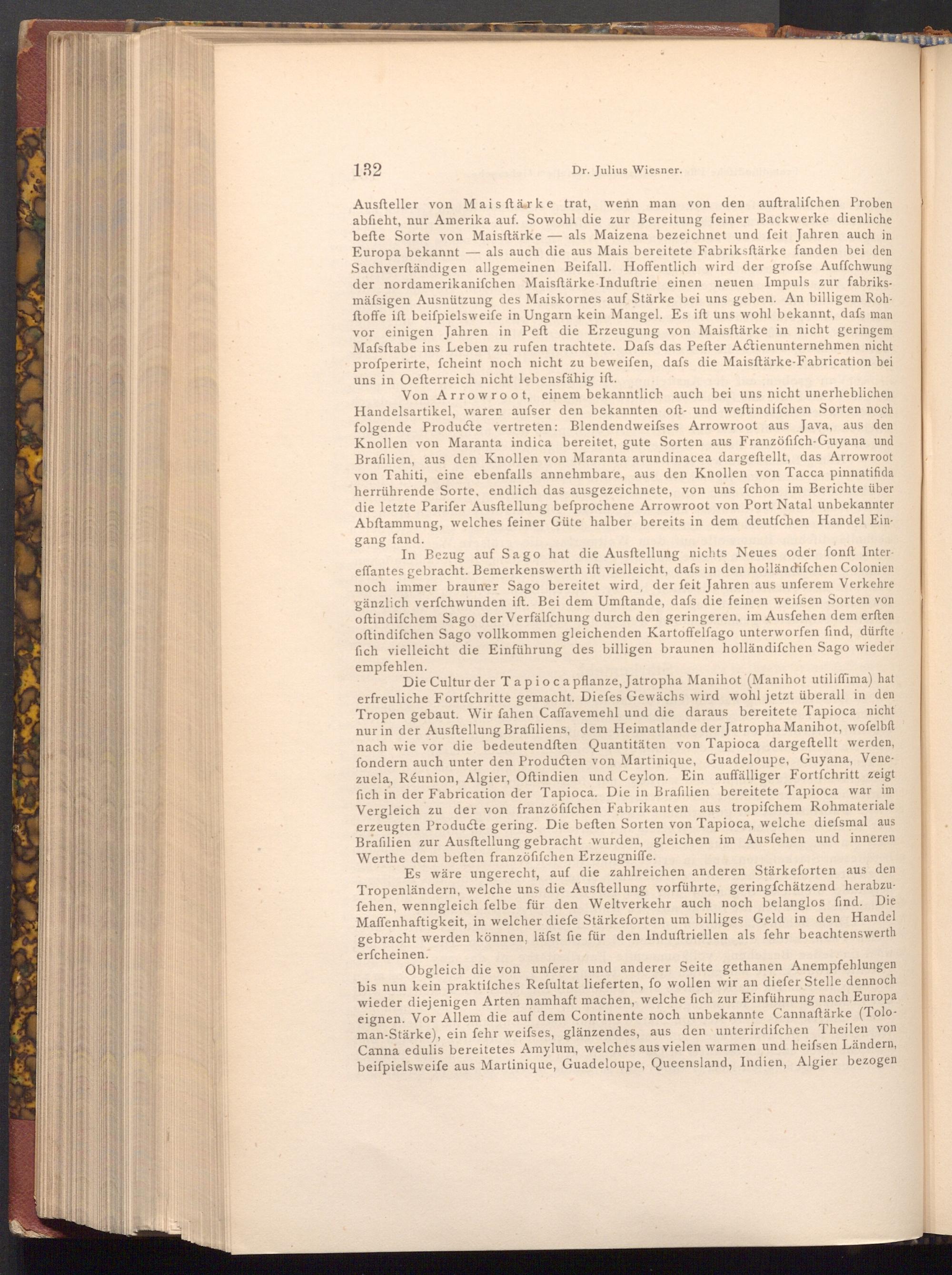 In Bezug auf Sago hat die Ausftellung nichts Neues oder fonft Intereffantes gebracht. Bemerkenswerth ift vielleicht, dafs in den holländifchen Colonien noch immer brauner Sago bereitet wird, der feit Jahren aus unferem Verkehre gänzlich verfchwunden ift. Bei dem Umftande, dafs die feinen weifsen Sorten von oftindifchem Sago der Verfälfchung durch den geringeren, im Ausfehen dem erften oftindifchen Sago vollkommen gleichenden Kartoffelfago unterworfen find, dürfte fich vielleicht die Einführung des billigen braunen holländifchen Sago wieder empfehlen.