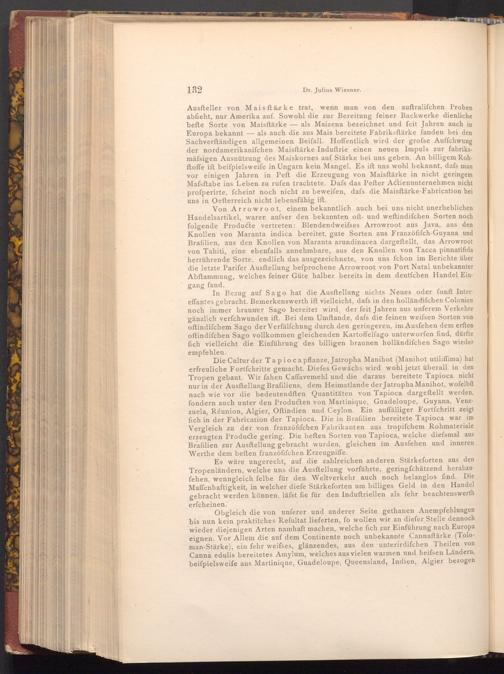 Von Arrowroot, einem bekanntlich auch bei uns nicht unerheblichen Handelsartikel, waren aufser den bekannten oft- und weftindifchen Sorten noch folgende Producte vertreten: Blendendweiſses Arrowroot aus Java, aus den Knollen von Maranta indica bereitet, gute Sorten aus Franzöfifch- Guyana und Brafilien, aus den Knollen von Maranta arundinacea dargeftellt, das Arrowroot von Tahiti, eine ebenfalls annehmbare, aus den Knollen von Tacca pinnatifida herrührende Sorte, endlich das ausgezeichnete, von uns fchon im Berichte über die letzte Parifer Ausftellung befprochene Arrowroot von Port Natal unbekannter Abftammung, welches feiner Güte halber bereits in dem deutfchen Handel Eingang fand.