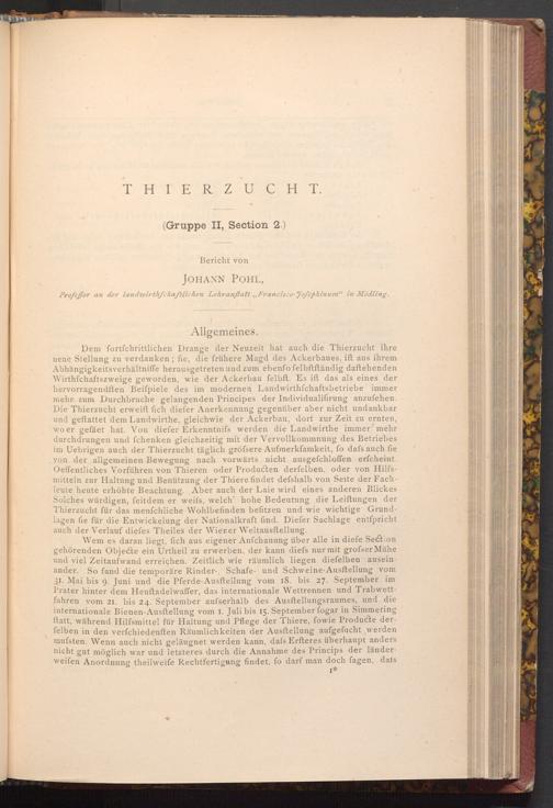 Dem fortfchrittlichen Drange der Neuzeit hat auch die Thierzucht ihre neue Stellung zu verdanken; fie, die frühere Magd des Ackerbaues, ift aus ihrem Abhängigkeitsverhältniffe herausgetreten und zum ebenfo felbftftändig daftehenden Wirthfchaftszweige geworden, wie der Ackerbau felbft. Es ift das als eines der hervorragendften Beiſpiele des im modernen Landwirthschaftsbetriebe immer mehr zum Durchbruche gelangenden Principes der Individualifirung anzufehen. Die Thierzucht erweift fich diefer Anerkennung gegenüber aber nicht undankbar und geftattet dem Landwirthe, gleichwie der Ackerbau, dort zur Zeit zu ernten, wo er gefäet hat. Von diefer Erkenntnifs werden die Landwirthe immer mehr durchdrungen und fchenken gleichzeitig mit der Vervollkommnung des Betriebes im Uebrigen auch der Thierzucht täglich gröfsere Aufmerkfamkeit, fo dafs auch fie von der allgemeinen Bewegung nach vorwärts nicht ausgefchloffen erfcheint. Oeffentliches Vorführen von Thieren oder Producten derfelben, oder von Hilfsmitteln zur Haltung und Benützung der Thiere findet defshalb von Seite der Fachleute heute erhöhte Beachtung. Aber auch der Laie wird eines anderen Blickes Solches würdigen, feitdem er weifs, welch' hohe Bedeutung die Leiftungen der Thierzucht für das menfchliche Wohlbefinden befitzen und wie wichtige Grundlagen fie für die Entwickelung der Nationalkraft find. Diefer Sachlage entſpricht auch der Verlauf diefes Theiles der Wiener Weltausstellung.