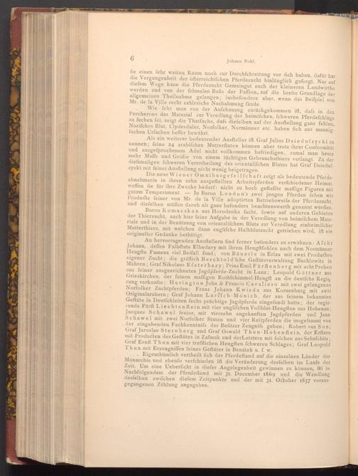 An hervorragenden Ausftellern find ferner befonders zu erwähnen: Afcht Johann, deffen Falbftute Elbedavy mit ihrem Hengftfohlen nach dem Normänner Hengfte Fameux viel Beifall fand; von Bäuerle in Erlaa mit zwei Producten eigener Zucht; die gräflich Berchtold'fche Geftütsverwaltung Buchlowitz in Mähren; Graf Nikolaus Efzterhazy; Prinz Emil Fürftenberg mit acht Proben aus feiner ausgezeichneten Jagdpferde- Zucht in Lana; Leopold Göttner aus Grieskirchen, der feinen maffigen Rothfchimmel- Hengft an die deutfche Regię. rung verkaufte; Herington John& Francis Cavaliero mit zwei gelungenen Norfolker Zuchtpferden; Franz Johann Kwizda aus Korneuburg mit zwei Originalarabern; Graf Johann Larifch- Mönich, der aus feinem bekannten Geftüte in Deutfchleiten fechs prächtige Jagdpferde eingefandt hatte; der regierende Fürft Liechtenftein mit vier englifchen Vollblut- Hengften aus Hohenau; Jacques Schawel fenior, mit vierzehn angekauften Jagdpferden und Jean Schawel mit zwei Norfolker Stuten und vier Reitpferden die insgesammt von der eingehenden Fachkenntnifs der Befitzer Zeugnifs geben; Robert van Son; Graf Jaroslav Sternberg und Graf Oswald Thun Hohenftein, der Erftere mit Producten des Geftütes in Zafmuk und derLetztere mit folchen aus Sehufchitz; Graf Ernft Thun mit vier trefflichen Hengften fchweren Schlages; Graf Leopold Thun mit Erzeugniffen feines Geftütes in Benátek u. f. w.