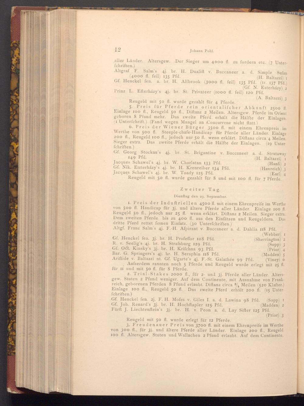 1. Preis der Induftriellen 4500 fl. mit einem Ehrenpreife im Werthe von 500 fl. Handicap für 3j. und ältere Pferde aller Länder. Einlage 100 fl. Reugeld 50 fl., jedoch nur 25 fl. wenn erklärt. Diftanz 2 Meilen. Sieger extra. Dem zweiten Pferde bis zu 400 fl. aus den Einfätzen und Reugeldern. Das dritte Pferd rettet feinen Einfatz.( 30 Unterfchriften.)