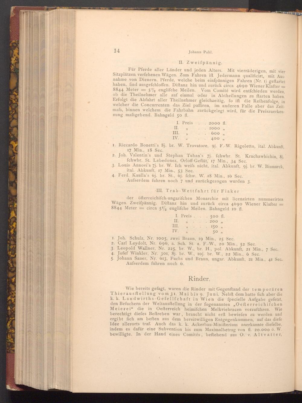 Für Pferde aller Länder und jeden Alters. Mit vierräderigen, mit vier Sitzplätzen verfehenen Wägen. Zum Fahren ift Jedermann qualificirt, mit Ausnahme von Dienern. Pferde, welche beim einfpännigen Fahren( Nr. 1) geftartet haben, find ausgefchloffen. Diftanz hin und zurück circa 4690 Wiener Klafter= 8844 Meter= 5% englifche Meilen. Vom Comité wird entfchieden werden, ob die Theilnehmer alle auf einmal oder in Abtheilungen zu ftarten haben. Erfolgt die Abfahrt aller Theilnehmer gleichzeitig, fo ift die Reihenfolge, in welcher die Concurrenten das Ziel paffiren, im anderen Falle aber das Zeitmafs, binnen welchem die Fahrbahn zurückgelegt wird, für die Preiszuerkennung mafsgebend. Bahngeld 50 fl.