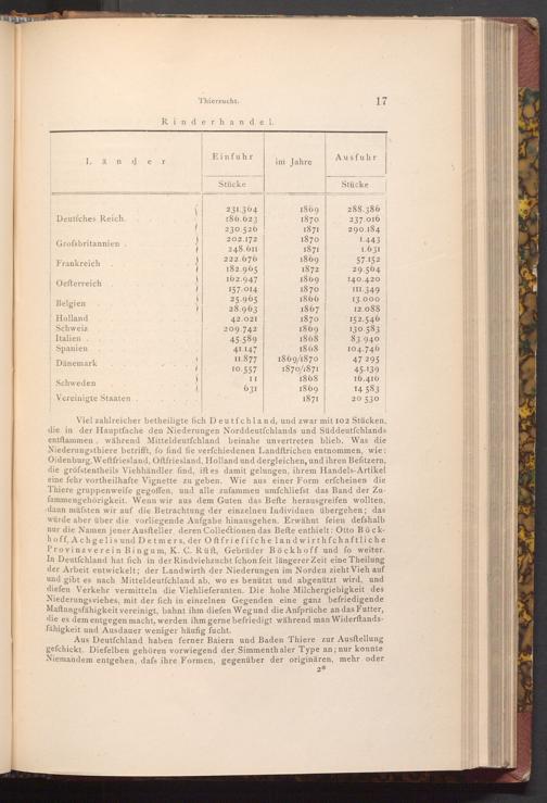 Viel zahlreicher betheiligte fich Deutfchland, und zwar mit 102 Stücken, die in der Hauptfaché den Niederungen Norddeutfchlands und Süddeutſchlands entftammen, während Mitteldeutſchland beinahe unvertreten blieb. Was die Niederungsthiere betrifft, fo find fie verfchiedenen Landftrichen entnommen, wie: Oldenburg, Weftfriesland, Oftfriesland, Holland und dergleichen, und ihren Befitzern, die gröfstentheils Viehhändler find, ift es damit gelungen, ihrem Handels- Artikel eine fehr vortheilhafte Vignette zu geben. Wie aus einer Form erfcheinen die Thiere gruppenweife gegoffen, und alle zufammen umfchliefst das Band der Zufammengehörigkeit. Wenn wir aus dem Guten das Befte herausgreifen wollten, dann müssten wir auf die Betrachtung der einzelnen Individuen übergehen; das würde aber über die vorliegende Aufgabe hinausgehen. Erwähnt feien defshalb nur die Namen jener Ausfteller, deren Collectionen das Befte enthielt: Otto Böckhoff, Achgelis und Detmers, der Oftfrie fifche landwirth fchaftliche Provinzverein Bingum, K. C. Rüft, Gebrüder Böckhoff und fo weiter. In Deutſchland hat fich in der Rindviehzucht fchon feit längerer Zeit eine Theilung der Arbeit entwickelt; der Landwirth der Niederungen im Norden zieht Vieh auf und gibt es nach Mitteldeutfchland ab, wo es benützt und abgenützt wird, und diefen Verkehr vermitteln die Viehlieferanten. Die hohe Milchergiebigkeit des Niederungsviehes, mit der fich in einzelnen Gegenden eine ganz befriedigende Maftungsfähigkeit vereinigt, bahnt ihm diefen Weg und die Anfprüche an das Futter, die es dem entgegen macht, werden ihm gerne befriedigt während man Widerftandsfähigkeit und Ausdauer weniger häufig fucht.