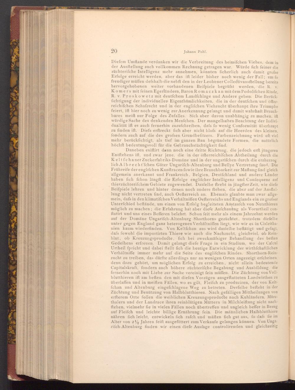 Diefem Umftande verdanken wir die Verbreitung des heimifchen Viehes, dem in der Ausftellung auch vollkommen Rechnung getragen war. Würde fich feiner die züchterifche Intelligenz mehr annehmen, könnten ficherlich auch damit grofse Erfolge erreicht werden, aber das ift leider bisher noch wenig der Fall; um fo freudiger müffen defshalb die nebft den in der Leobener Collectivausftellung bereits hervorgehobenen weiter vorhandenen Beifpiele begrüfst werden, die R. v. Komers mit feinen Egerländern, Baron Romaczkan mit dem Podolifchen Rinde, R. v. Proskowetz mit deutfchem Landfchlage und Andere geben. Die Berückfichtigung der individuellen Eigenthümlichkeiten, die in der deutfchen und öfterreichifchen Schafzucht und in der englifchen Viehzucht überhaupt ihre Triumphe feiert, ift hier noch zu wenig zur Anerkennung gelangt und damit wahrhaft Brauchbares meift nur Folge des Zufalles. Sich aber davon unabhängig zu machen, ift würdige Sache des denkenden Menfchen. Der mangelhaften Beachtung der Indivi. dualität ift es auch fernerhin zuzufchreiben, dafs fo wenig Conformität überhaupt zu finden ift. Diefs erftreckt fich aber nicht blofs auf die Heerden des kleinen, fondern auch auf die des grofsen Grundbefitzers. Farbenzeichnung wird oft viel mehr berücksichtigt, als tief im ganzen Bau begründete Formen, die natürlich höchft bedeutungsvoll für die Gebrauchstüchtigkeit find.