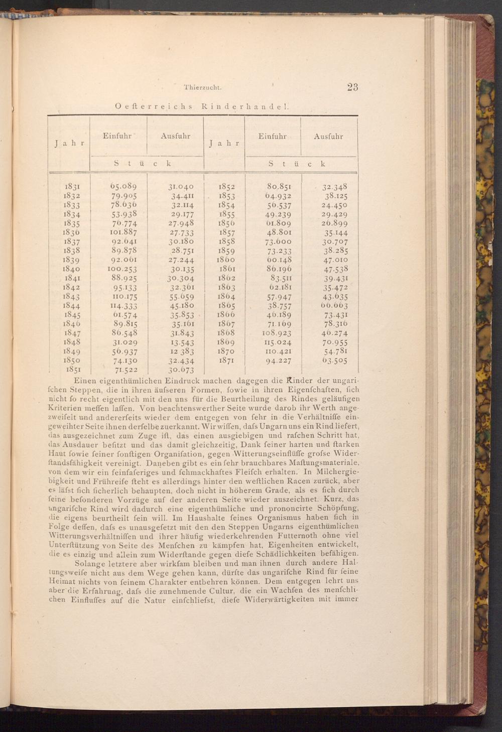 Einen eigenthümlichen Eindruck machen dagegen die Kinder der ungarifchen Steppen, die in ihren äufseren Formen, fowie in ihren Eigenfchaften, fich nicht fo recht eigentlich mit den uns für die Beurtheilung des Rindes geläufigen Kriterien meffen laffen. Von beachtenswerther Seite wurde darob ihr Werth angezweifelt und andererfeits wieder dem entgegen von fehr in die Verhältniffe eingeweihter Seite ihnen derfelbe zuerkannt. Wir wiffen, dafs Ungarn uns ein Rind liefert, das ausgezeichnet zum Zuge ift, das einen ausgiebigen und rafchen Schritt hat, das Ausdauer befitzt und das damit gleichzeitig, Dank feiner harten und ftarken Haut fowie feiner fonftigen Organiſation, gegen Witterungseinflüffe grofse Widerftandsfähigkeit vereinigt. Daneben gibt es ein fehr brauchbares Maftungsmateriale, von dem wir ein feinfaferiges und fchmackhaftes Fleiſch erhalten. In Milchergiebigkeit und Frühreife fteht es allerdings hinter den weftlichen Racen zurück, aber es läfst fich ficherlich behaupten, doch nicht in höherem Grade, als es fich durch feine befonderen Vorzüge auf der anderen Seite wieder auszeichnet. Kurz, das ungarifche Rind wird dadurch eine eigenthümliche und prononcirte Schöpfung, die eigens beurtheilt fein will. Im Haushalte feines Organismus haben fich in Folge deffen, dafs es unausgefetzt mit den den Steppen Ungarns eigenthümlichen Witterungsverhältniffen und ihrer häufig wiederkehrenden Futternoth ohne viel Unterſtützung von Seite des Menfchen zu kämpfen hat, Eigenheiten entwickelt, die es einzig und allein zum Widerftande gegen diefe Schädlichkeiten befähigen. Solange letztere aber wirkfam bleiben und man ihnen durch andere Haltungsweife nicht aus dem Wege gehen kann, dürfte das ungarifche Rind für feine Heimat nichts von feinem Charakter entbehren können. Dem entgegen lehrt uns aber die Erfahrung, dafs die zunehmende Cultur, die ein Wachfen des menfchlichen Einfluffes auf die Natur einfchliefst, diefe Widerwärtigkeiten mit immer