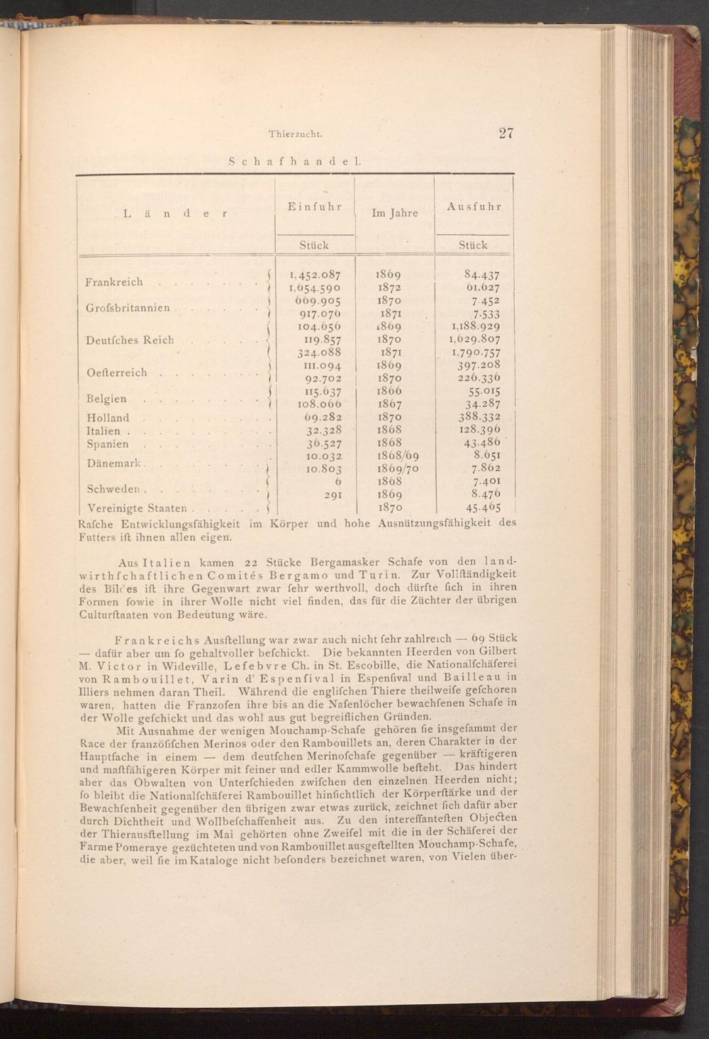 Aus Italien kamen 22 Stücke Bergamasker Schafe von den landwirth fchaftlichen Comités Bergamo und Turin. Zur Vollständigkeit des Bildes ift ihre Gegenwart zwar fehr werthvoll, doch dürfte fich in ihren Formen fowie in ihrer Wolle nicht viel finden, das für die Züchter der übrigen Culturftaaten von Bedeutung wäre.