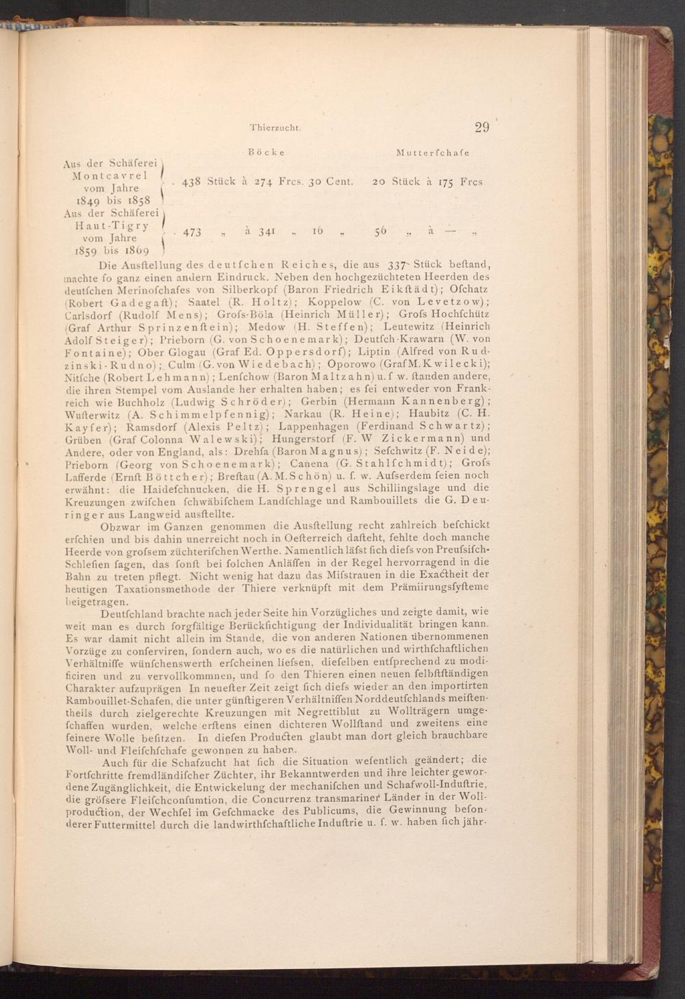 Deutſchland brachte nach jeder Seite hin Vorzügliches und zeigte damit, wie weit man es durch forgfältige Berücksichtigung der Individualität bringen kann. Es war damit nicht allein im Stande, die von anderen Nationen übernommenen Vorzüge zu conferviren, fondern auch, wo es die natürlichen und wirthschaftlichen. Verhältniffe wünfchenswerth erfcheinen liefsen, diefelben entſprechend zu modificiren und zu vervollkommnen, und fo den Thieren einen neuen felbftftändigen Charakter aufzuprägen In neuefter Zeit zeigt fich diefs wieder an den importirten Rambouillet- Schafen, die unter günftigeren Verhältniffen Norddeutſchlands meiftentheils durch zielgerechte Kreuzungen mit Negrettiblut zu Wollträgern umgefchaffen wurden, welche erftens einen dichteren Wollftand und zweitens eine feinere Wolle befitzen. In diefen Producten glaubt man dort gleich brauchbare Woll- und Fleifchfchafe gewonnen zu haben.