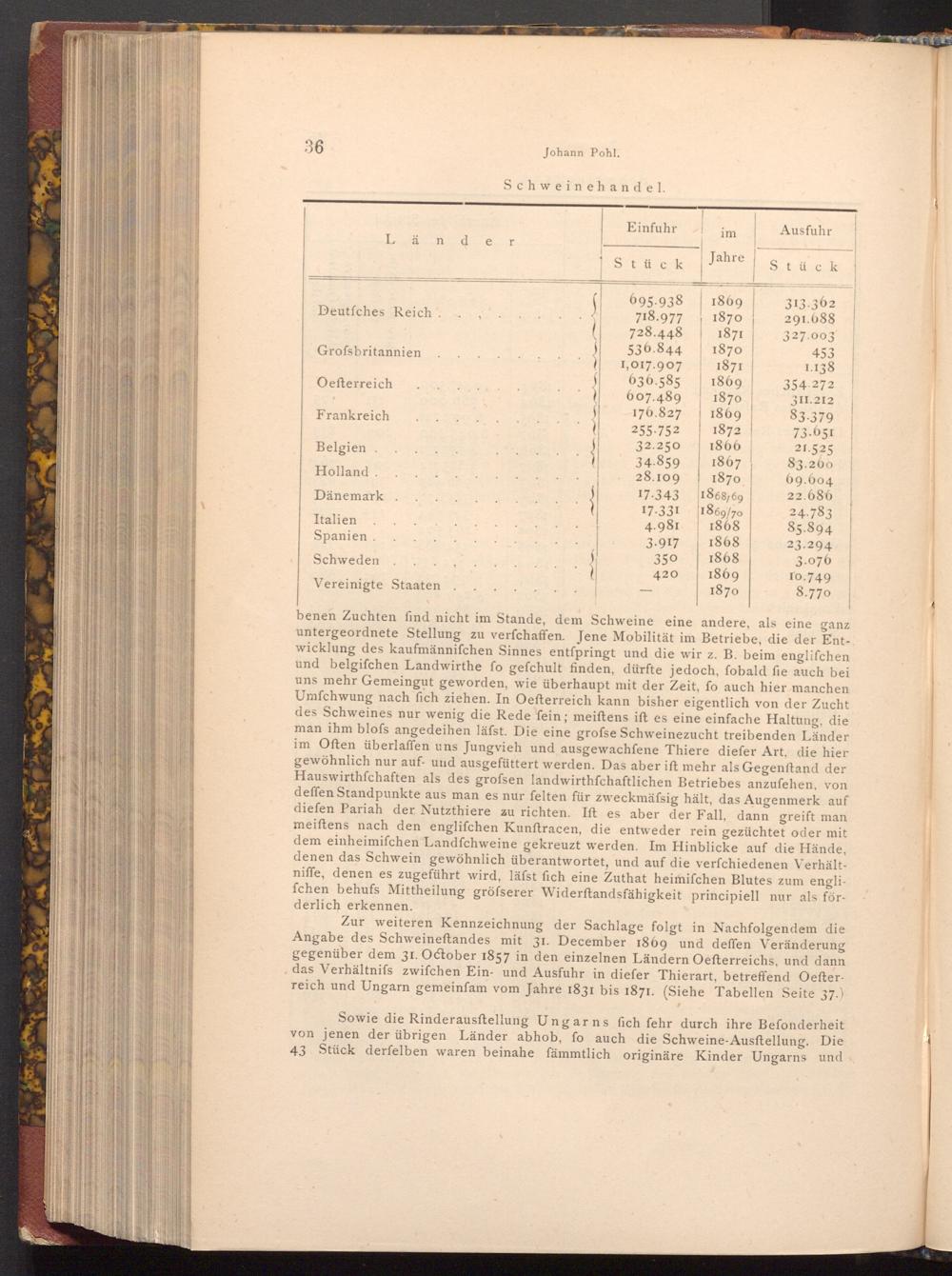 Zur weiteren Kennzeichnung der Sachlage folgt in Nachfolgendem die Angabe des Schweineftandes mit 31. December 1869 und deffen Veränderung gegenüber dem 31. October 1857 in den einzelnen Ländern Oefterreichs, und dann das Verhältnifs zwifchen Ein- und Ausfuhr in diefer Thierart, betreffend Oefterreich und Ungarn gemeinfam vom Jahre 1831 bis 1871.( Siehe Tabellen Seite 37.)