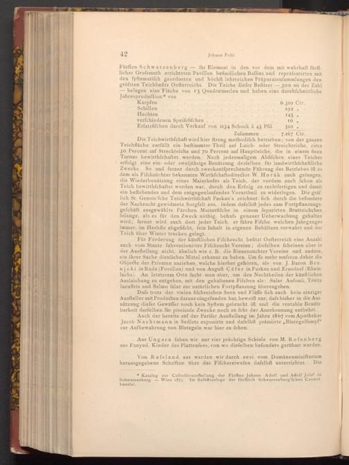 Fürften Schwarzenberg- ihr Element in den vor dem mit wahrhaft fürftlicher Grofsmuth errichteten Pavillon befindlichen Baffins und repräfentirten mit den fyftematiſch geordneten und höchft lehrreichen Präparatenfammlungen den gröfsten Teichbefitz Oefterreichs. Die Teiche diefer Befitzer 300 an der Zahl belegen eine Fläche von 15 Quadratmeilen und haben eine durchschnittliche Jahresproduction* von 6.310 Ctr. 192"