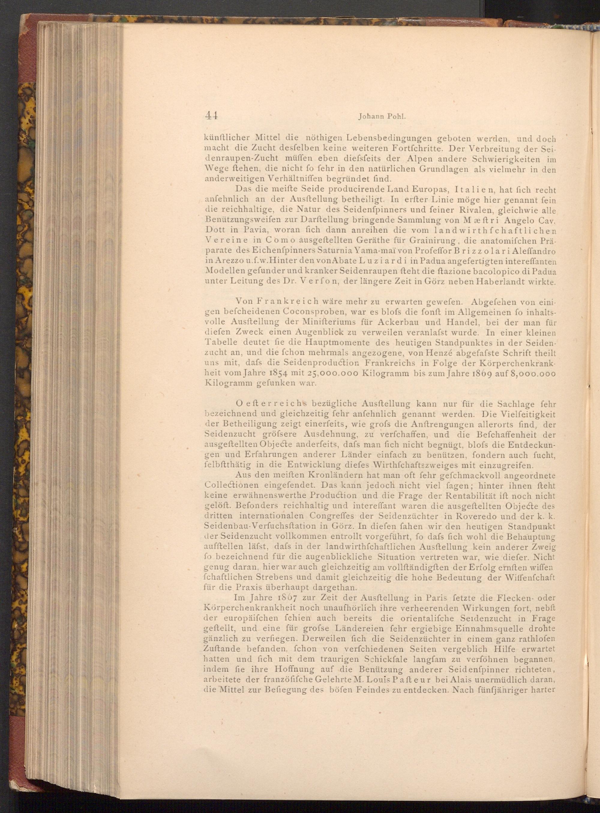 Im Jahre 1867 zur Zeit der Ausftellung in Paris fetzte die Flecken oder Körperchenkrankheit noch unaufhörlich ihre verheerenden Wirkungen fort, nebft der europäiſchen fchien auch bereits die orientalifche Seidenzucht in Frage geftellt, und eine für grofse Ländereien fehr ergiebige Einnahmsquelle drohte gänzlich zu verfiegen. Derweilen fich die Seidenzüchter in einem ganz rathlofen Zuftande befanden, fchon von verfchiedenen Seiten vergeblich Hilfe erwartet hatten und fich mit dem traurigen Schickfale langfam zu verföhnen begannen, indem fie ihre Hoffnung auf die Benützung anderer Seidenfpinner richteten, arbeitete der franzöfifche Gelehrte M. Louis Pafteur bei Alais unermüdlich daran, die Mittel zur Befiegung des böfen Feindes zu entdecken. Nach fünfjähriger harter