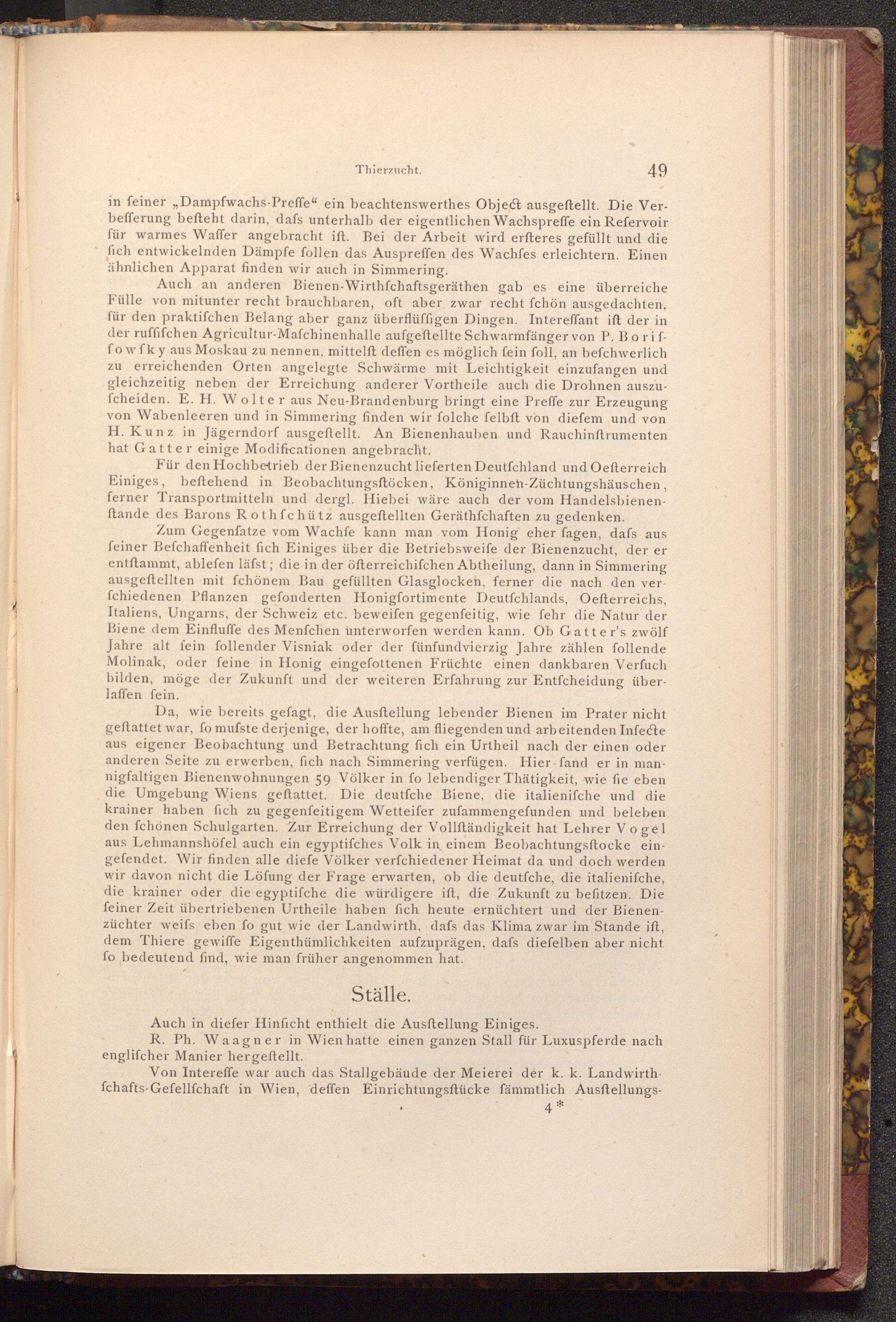 Zum Gegenfatze vom Wachfe kann man vom Honig eher fagen, dafs aus feiner Befchaffenheit fich Einiges über die Betriebsweife der Bienenzucht, der er entftammt, ablefen läfst; die in der öfterreichifchen Abtheilung, dann in Simmering ausgeftellten mit fchönem Bau gefüllten Glasglocken, ferner die nach den verfchiedenen Pflanzen gefonderten Honigfortimente Deutſchlands, Oefterreichs, Italiens, Ungarns, der Schweiz etc. beweifen gegenfeitig, wie fehr die Natur der Biene dem Einfluffe des Menfchen unterworfen werden kann. Ob Gatter's zwölf Jahre alt fein follender Visniak oder der fünfundvierzig Jahre zählen follende Molinak, oder feine in Honig eingefottenen Früchte einen dankbaren Verfuch bilden, möge der Zukunft und der weiteren Erfahrung zur Entfcheidung überlaffen fein.