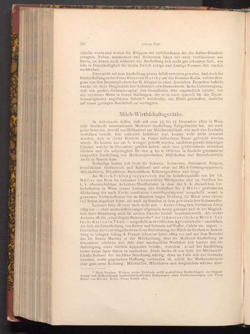 An Milch- Prüfungsapparaten war im Induftriepalafte von Dr. Ch. Müller aus Bern die bekannte fchweizerifche Milchprobe und im Pavillon des k. k. öfterreichifchen Ackerbau- Minifteriums in dem der k. k. chemifchen Verfuchsftation in Wien( unter Leitung des Profeffors Dr. J. Mofer gewidmeten Abtheilung der nach Fuchs conftruirte Centrifugalapparat ausgeftellt, womit in genannter Verfuchsftation bei 20 Minuten langer Drehung die Milch etwa ebenfo viel Rahm abgefetzt hatte, als nach 24 Stunden in dem gewöhnlichen Rahmmeffer. Letztere Idee ift zwar auch nicht neu Fuchs fchlug fein Verfahren fchon 1859 vor aber nichtsdeftoweniger allgemein wenig gekannt und ob der Möglichkeit ihrer Benutzung auch für andere Zwecke höchft beachtenswerth. Als nichts Anderes ift die, centrifugale Butterprobe" der fchweizerifchen Milch- Verfuchsftation in Thun- ausgeftellt in der öftlichen Agriculturhalle anzufehen, die fich zur Unterfuchung von Butter und Schmalz auf Waffer, Cafeïn etc. eignet. Das Gefetz der Centrifugalkraft auch zur Entrahmung der Milch im Grofsen in Anwendung zu bringen, fchlug A. Prandtl fchon im Jahre 1864 vor und aus dem Berichte des Dr. Benno Martiny in der Milchzeitung, über die Molkerei- Ausstellung im December, erfahren wir, dafs eine mechanifche Werkstatt fich bereits mit der Anfertigung eines folchen Apparates befaffe; trotzdem ar auf der Ausftellung leider keine Spur davon zu entdecken. Diefe Sache ift von Seite der Milchwirthfchafts- Befitzer der höchften Beachtung würdig, denn im Falle fich der Gedanke bewährt, wofür gegründete Hoffnung vorhanden ift, erhält der Molkereibetrieb eine ganz neue Richtung; Milchkeller, Milchfatten und dergleichen würden über