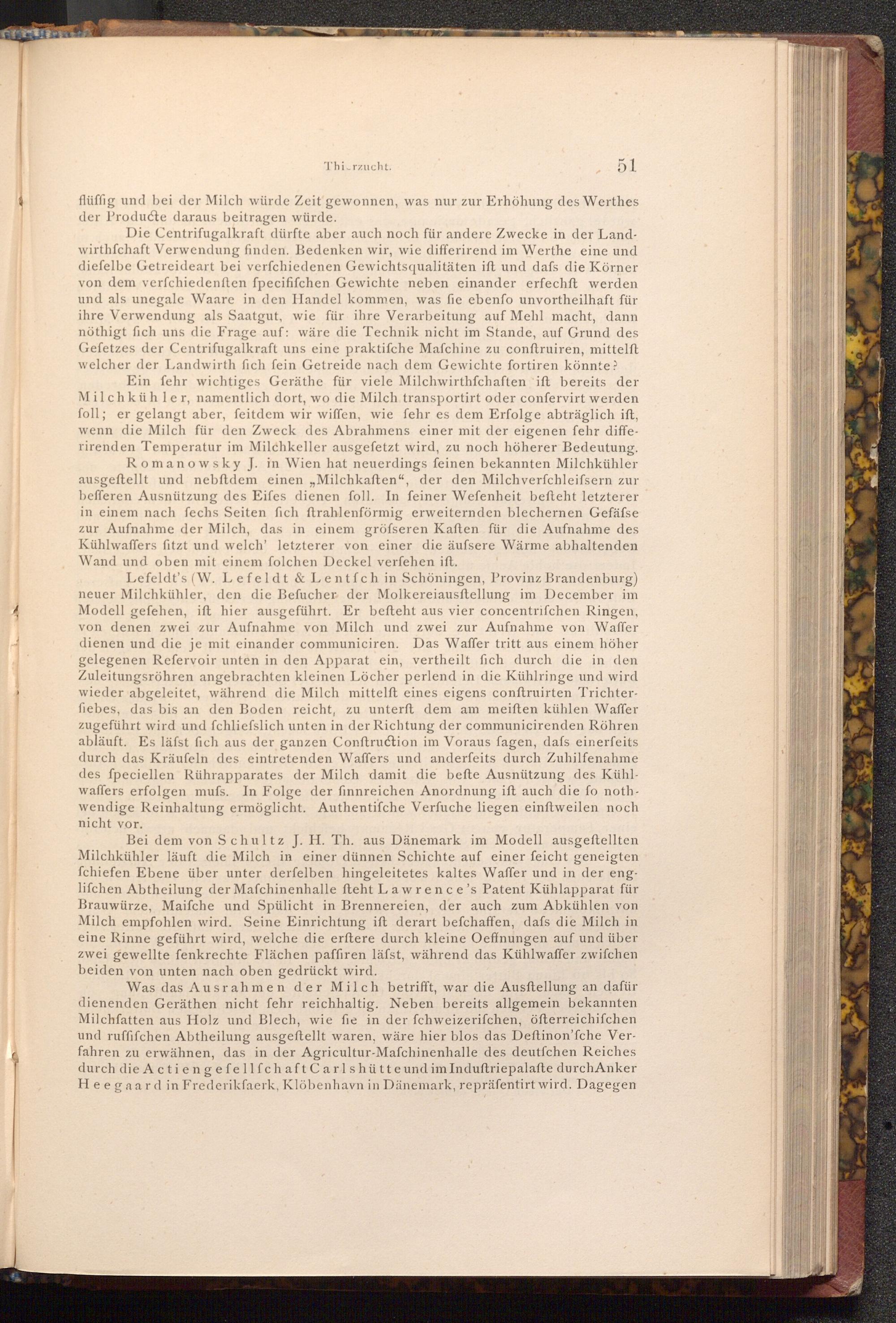Bei dem von Schultz J. H. Th. aus Dänemark im Modell ausgeftellten Milchkühler läuft die Milch in einer dünnen Schichte auf einer feicht geneigten fchiefen Ebene über unter derfelben hingeleitetes kaltes Waffer und in der englifchen Abtheilung der Maſchinenhalle fteht Lawrence's Patent Kühlapparat für Brauwürze, Maifche und Spülicht in Brennereien, der auch zum Abkühlen von Milch empfohlen wird. Seine Einrichtung ift derart befchaffen, dafs die Milch in eine Rinne geführt wird, welche die erftere durch kleine Oeffnungen auf und über zwei gewellte fenkrechte Flächen paffiren läfst, während das Kühlwaffer zwifchen beiden von unten nach oben gedrückt wird.
