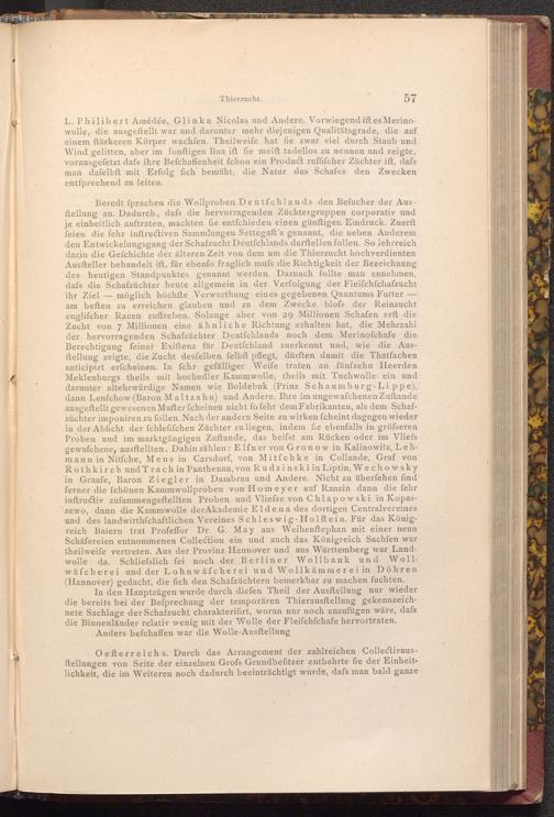 L. Philibert Amédée, Glinka Nicolas und Andere. Vorwiegend ift es Merinowolle, die ausgeftellt war und darunter mehr diejenigen Qualitätsgrade, die auf einem ftärkeren Körper wachfen. Theilweife hat fie zwar viel durch Staub und Wind gelitten, aber im fonftigen Bau ift fie meift tadellos zu nennen und zeigte, vorausgefetzt dafs ihre Befchaffenheit fchon ein Product ruffifcher Züchter ift, dafs man dafelbft mit Erfolg fich bemüht, die Natur des Schafes den Zwecken entfprechend zu leiten.