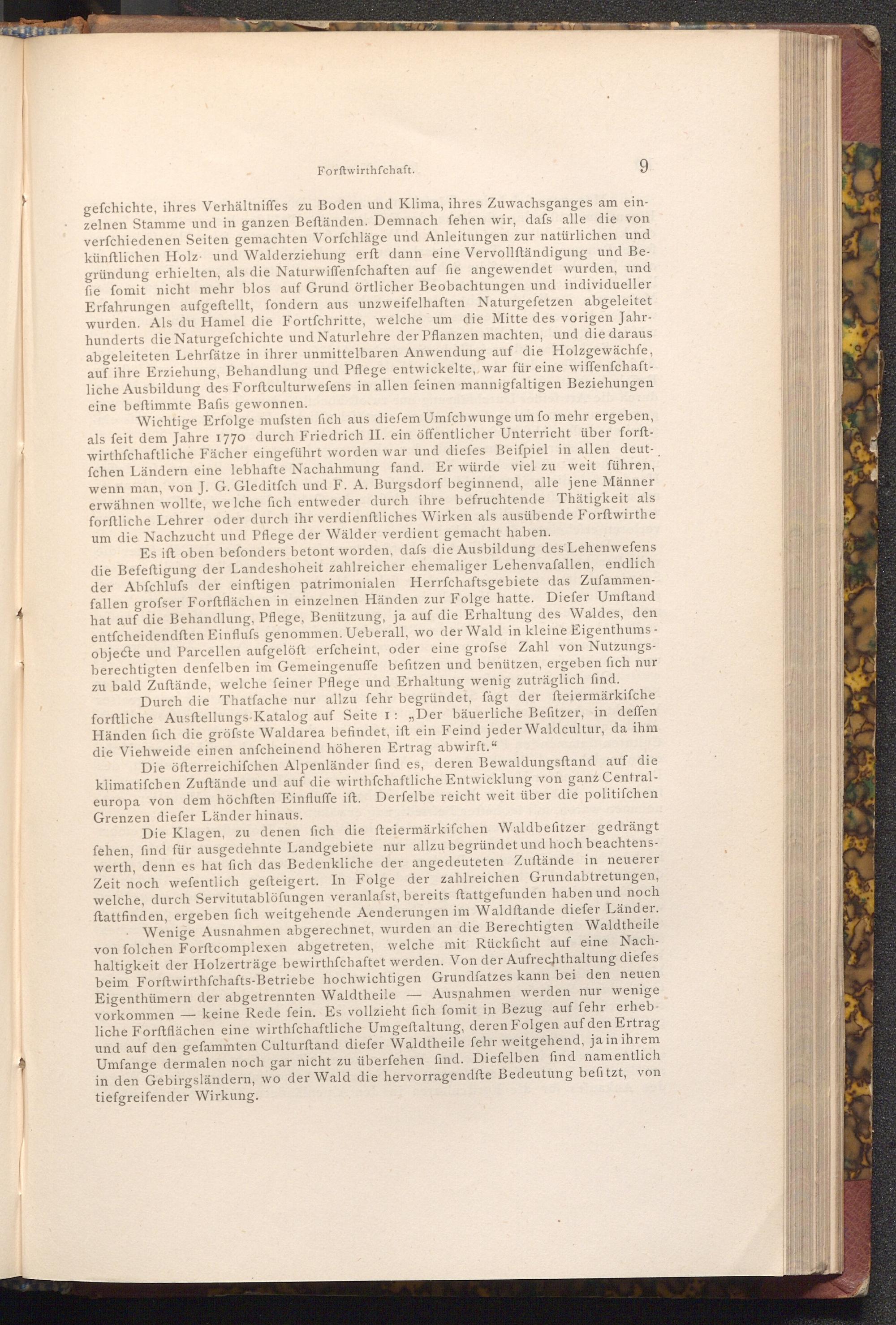 Wichtige Erfolge mufsten fich aus diefem Umfchwunge um fo mehr ergeben, als feit dem Jahre 1770 durch Friedrich II. ein öffentlicher Unterricht über forftwirthschaftliche Fächer eingeführt worden war und diefes Beiſpiel in allen deutfchen Ländern eine lebhafte Nachahmung fand. Er würde viel zu weit führen, wenn man, von J. G. Gleditfch und F. A. Burgsdorf beginnend, alle jene Männer erwähnen wollte, welche fich entweder durch ihre befruchtende Thätigkeit als forftliche Lehrer oder durch ihr verdienftliches Wirken als ausübende Forstwirthe um die Nachzucht und Pflege der Wälder verdient gemacht haben.