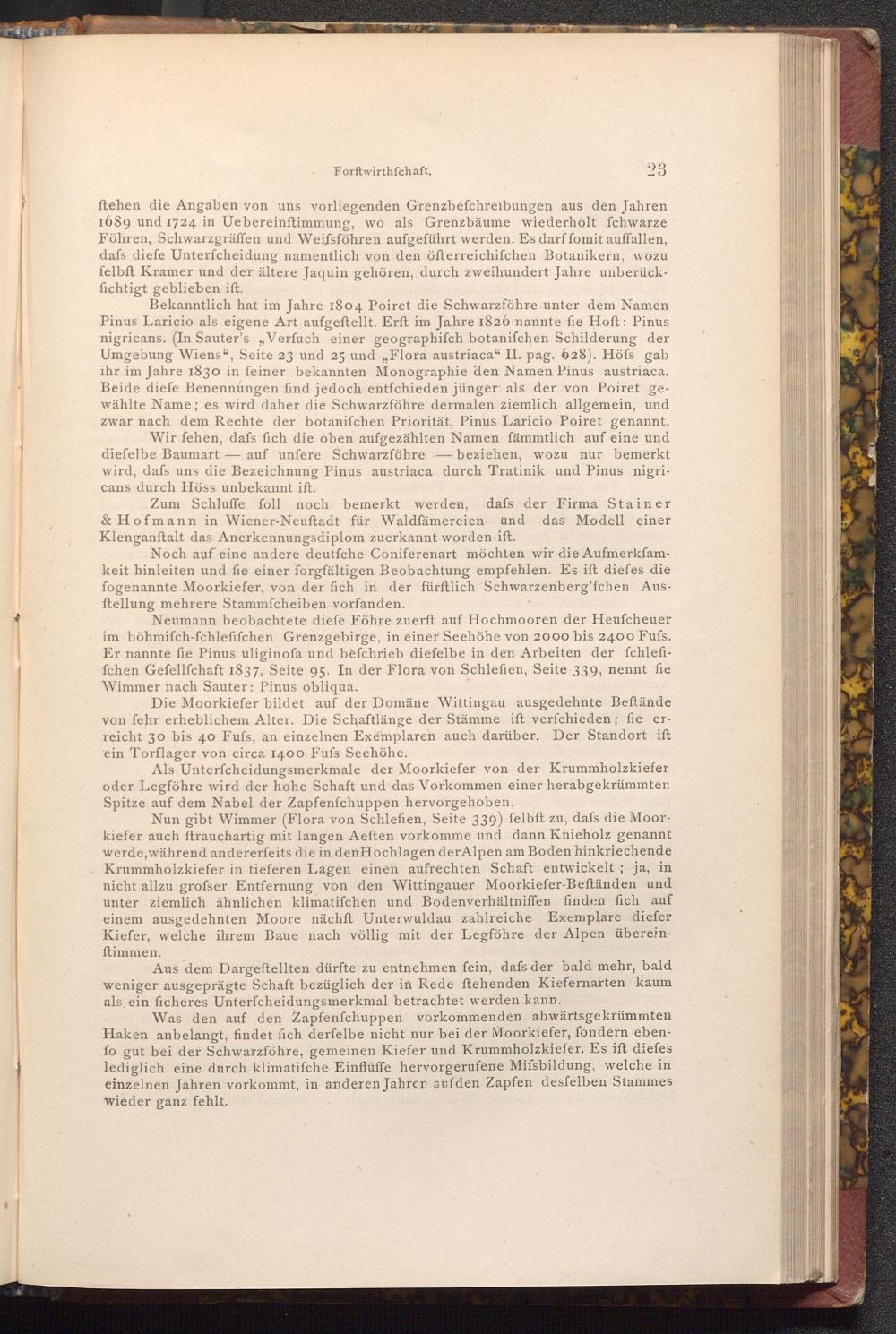 ftehen die Angaben von uns vorliegenden Grenzbefchreibungen aus den Jahren 1689 und 1724 in Uebereinstimmung, wo als Grenzbäume wiederholt fchwarze Föhren, Schwarzgräffen und Weifsföhren aufgeführt werden. Es darf fomit auffallen, dafs diefe Unterfcheidung namentlich von den öfterreichifchen Botanikern, wozu felbft Kramer und der ältere Jaquin gehören, durch zweihundert Jahre unberückfichtigt geblieben ift.