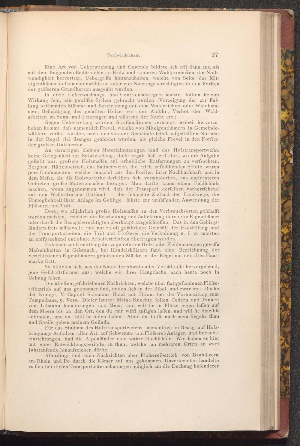 Dort, wo alljährlich grofse Holzmaffen zu den Verbrauchsorten gefchafft werden mussten, erfchien die Bearbeitung und Zulieferung durch die Eigenthümer oder durch die Bezugsberechtigten überhaupt ausgefchloffen. Das in den Gebirgsländern ftets mühevolle und nur zu oft gefährliche Gefchäft der Holzfällung und der Transportarbeiten, die Trift und Flöfserei, die Verkohlung u. f. w. mussten an entſprechend entlohnte Arbeiterfchaften übertragen werden.
