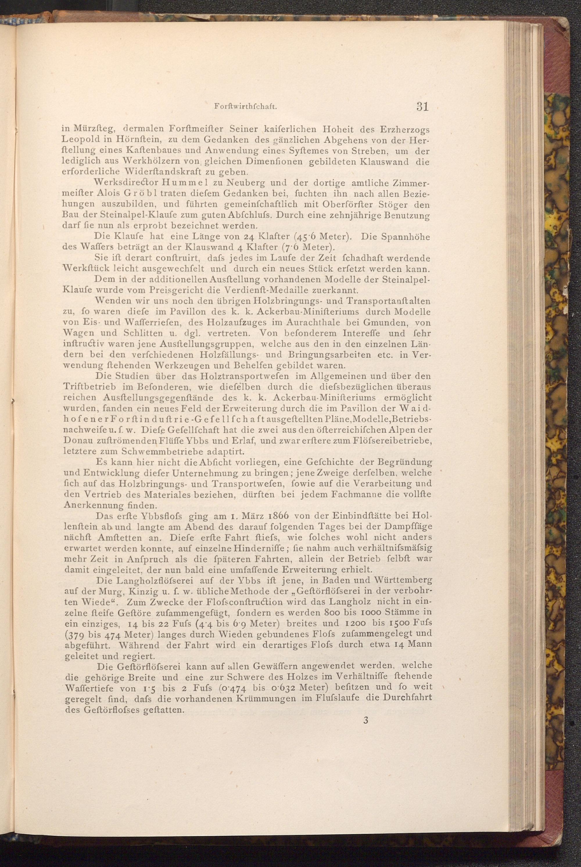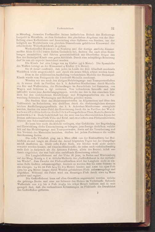 Die Studien über das Holztransportwefen im Allgemeinen und über den Triftbetrieb im Befonderen, wie diefelben durch die diefsbezüglichen überaus reichen Ausftellungsgegenstände des k. k. Ackerbau- Minifteriums ermöglicht wurden, fanden ein neues Feld der Erweiterung durch die im Pavillon der Waidhofener Forftinduftrie- Gefellfchaft ausgeftellten Pläne, Modelle, Betriebsnachweiſe u. f. w. Diefe Gefellfchaft hat die zwei aus den öfterreichifchen Alpen der Donau zuftrömenden Flüffe Ybbs und Erlaf, und zwar erftere zum Flöfsereibetriebe, letztere zum Schwemmbetriebe adaptirt.