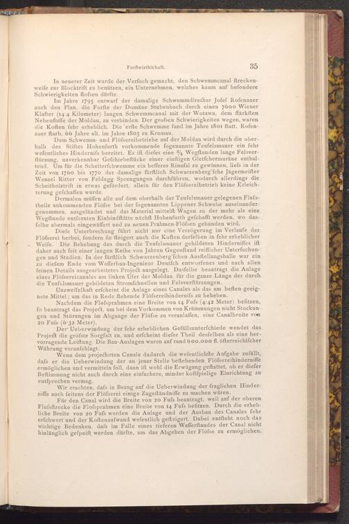 Diefe Unterbrechung führt nicht nur eine Verzögerung im Verlaufe der Flöfserei herbei, fondern fie fteigert auch die Koften derfelben in fehr erheblicher Weife. Die Behebung des durch die Teufelsmauer gebildeten Hinderniffes ift daher auch feit einer langen Reihe von Jahren Gegenftand reiflicher Unterfuchunund Studien. In der fürftlich Schwarzenberg'fchen Ausftellungshalle war ein zu diefem Ende vom Wafferbau- Ingenieur Deutfch entworfenes und nach allen feinen Details ausgearbeitetes Project ausgelegt. Dasfelbe beantragt die Anlage eines Flöfsereicanales am linken Ufer der Moldau, für die ganze Länge der durch die Teufelsmauer gebildeten Stromfchnellen und Felsverftürzungen.