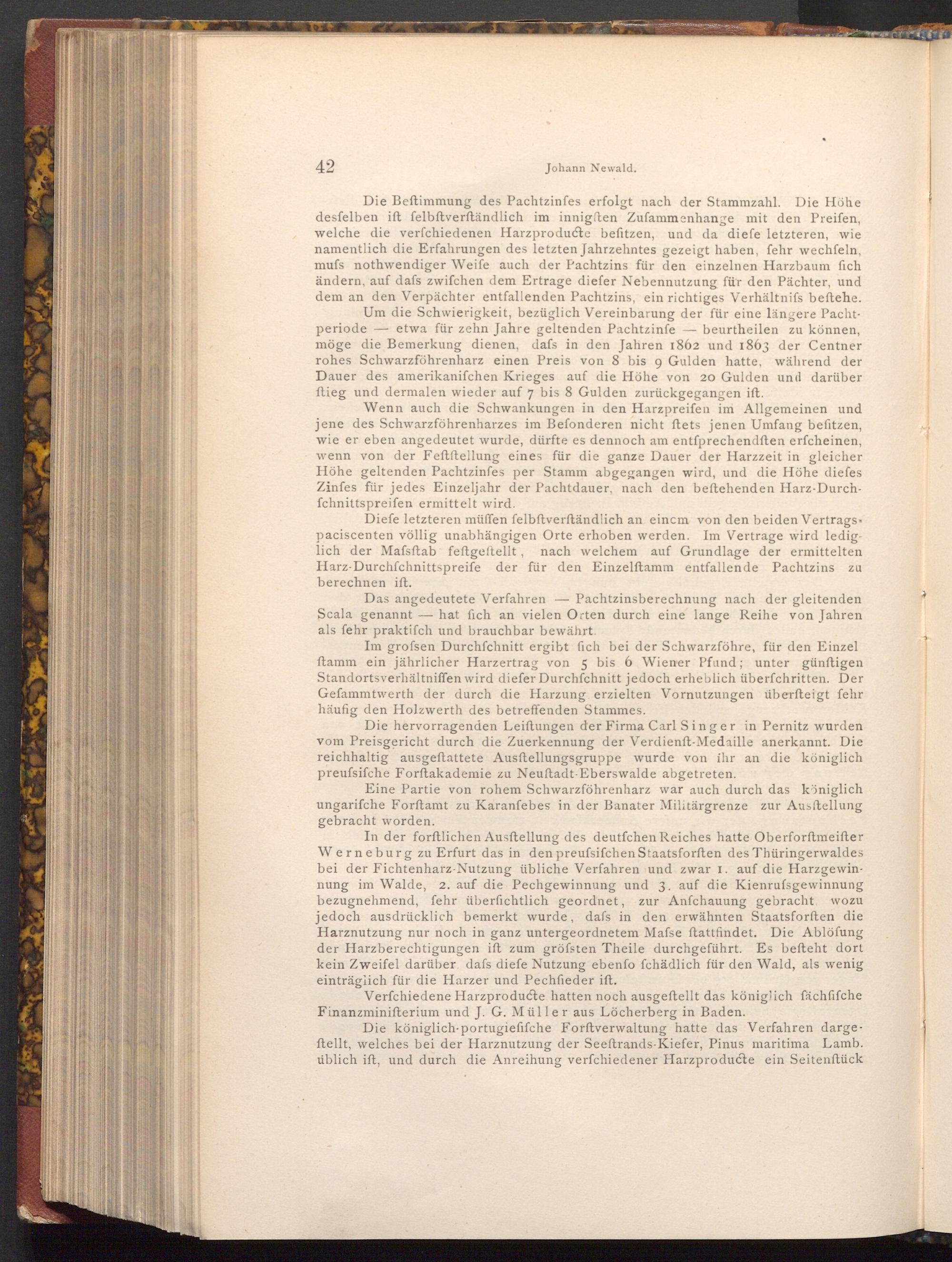Die Beftimmung des Pachtzinfes erfolgt nach der Stammzahl. Die Höhe desfelben ift felbftverständlich im innigften Zufammenhange mit den Preifen, welche die verfchiedenen Harzproducte befitzen, und da diefe letzteren, wie namentlich die Erfahrungen des letzten Jahrzehntes gezeigt haben, fehr wechſeln, mufs nothwendiger Weife auch der Pachtzins für den einzelnen Harzbaum fich ändern, auf dafs zwifchen dem Ertrage diefer Nebennutzung für den Pächter, und dem an den Verpächter entfallenden Pachtzins, ein richtiges Verhältnifs beftehe. Um die Schwierigkeit, bezüglich Vereinbarung der für eine längere Pachtperiode etwa für zehn Jahre geltenden Pachtzinfe beurtheilen zu können, möge die Bemerkung dienen, dafs in den Jahren 1862 und 1863 der Centner rohes Schwarzföhrenharz einen Preis von 8 bis 9 Gulden hatte, während der Dauer des amerikanifchen Krieges auf die Höhe von 20 Gulden und darüber ftieg und dermalen wieder auf 7 bis 8 Gulden zurückgegangen ift.