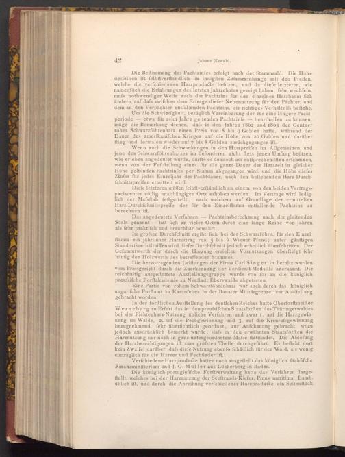 In der forftlichen Ausftellung des deutfchen Reiches hatte Oberforftmeifter Werneburg zu Erfurt das in den preufsifchen Staatsforften des Thüringerwaldes bei der Fichtenharz- Nutzung übliche Verfahren und zwar I. auf die Harzgewinnung im Walde, 2. auf die Pechgewinnung und 3. auf die Kienrufsgewinnung bezugnehmend, fehr überfichtlich geordnet, zur Anfchauung gebracht wozu jedoch ausdrücklich bemerkt wurde, dafs in den erwähnten Staatsforften die Harznutzung nur noch in ganz untergeordnetem Mafse ftattfindet. Die Ablöfung der Harzberechtigungen ift zum gröfsten Theile durchgeführt. Es befteht dort kein Zweifel darüber dafs diefe Nutzung ebenfo fchädlich für den Wald, als wenig einträglich für die Harzer und Pechfieder ift.