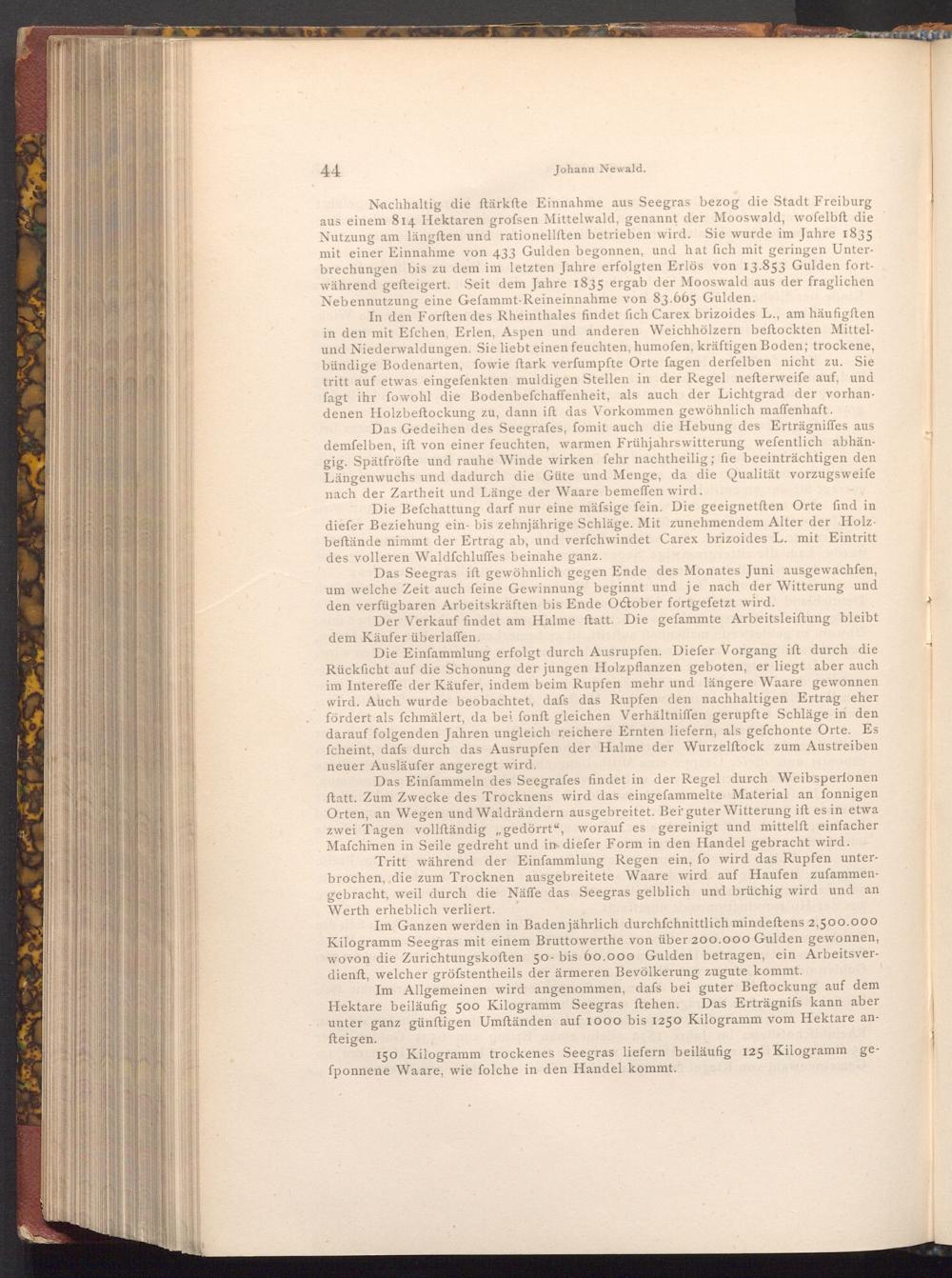 Nachhaltig die ftärkfte Einnahme aus Seegras bezog die Stadt Freiburg aus einem 814 Hektaren grofsen Mittelwald, genannt der Mooswald, wofelbft die Nutzung am längften und rationellften betrieben wird. Sie wurde im Jahre 1835 mit einer Einnahme von 433 Gulden begonnen, und hat fich mit geringen Unterbrechungen bis zu dem im letzten Jahre erfolgten Erlös von 13.853 Gulden fortwährend gefteigert. Seit dem Jahre 1835 ergab der Mooswald aus der fraglichen Nebennutzung eine Gefammt- Reineinnahme von 83.665 Gulden.