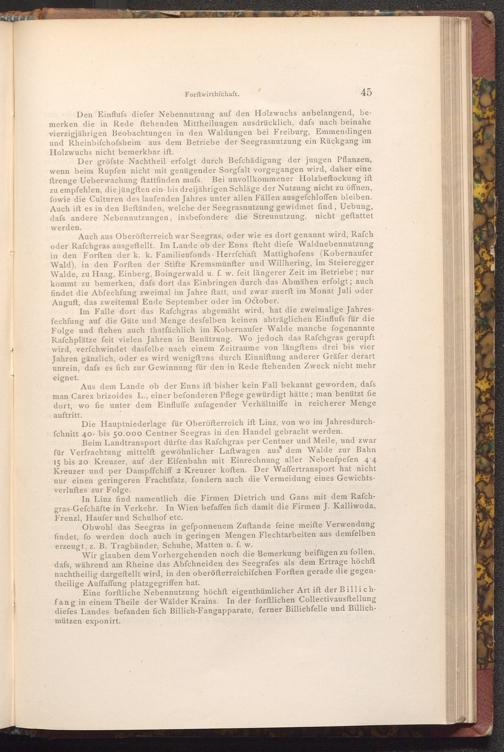 Auch aus Oberösterreich war Seegras, oder wie es dort genannt wird, Rafch oder Rafchgras ausgeftellt. Im Lande ob der Enns fteht diefe Waldnebennutzung in den Forften der k. k. Familienfonds Herrfchaft Mattighofens( Kobernaufer Wald), in den Forften der Stifte Kremsmünfter und Willhering, im Steieregger Walde, zu Haag, Einberg, Boingerwald u. f. w. feit längerer Zeit im Betriebe; nur kommt zu bemerken, dafs dort das Einbringen durch das Abmähen erfolgt; auch findet die Abfechfung zweimal im Jahre ftatt, und zwar zuerft im Monat Juli oder Auguft, das zweitemal Ende September oder im October. og Im Falle dort das Rafchgras abgemäht wird, hat die zweimalige Jahresfechfung auf die Güte und Menge desfelben keinen abträglichen Einfluss für die Folge und ftehen auch thatfächlich im Kobernaufer Walde manche fogenannte Rafchplätze feit vielen Jahren in Benützung. Wo jedoch das Rafchgras gerupft wird, verfchwindet dasfelbe nach einem Zeitraume von längftens drei bis vier Jahren gänzlich, oder es wird wenigftens durch Einniftung anderer Gräfer derart unrein, dafs es fich zur Gewinnung für den in Rede ftehenden Zweck nicht mehr eignet.