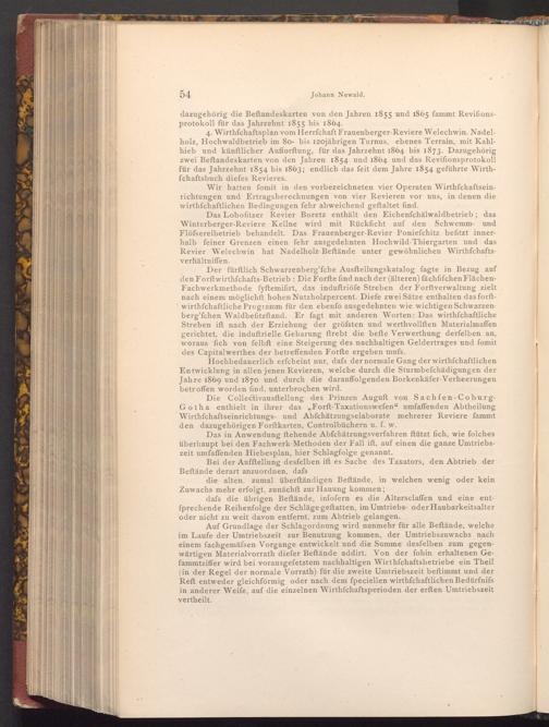 4. Wirthfchaftsplan vom Herrfchaft Frauenberger- Reviere Welechwin. Nadelholz, Hochwaldbetrieb im 80- bis 120jährigen Turnus, ebenes Terrain, mit Kahlhieb und künftlicher Aufforftung, für das Jahrzehnt 1864 bis 1873. Dazugehörig zwei Beftandeskarten von den Jahren 1854 und 1864 und das Revifionsprotokoll für das Jahrzehnt 1854 bis 1863; endlich das feit dem Jahre 1854 geführte Wirthfchaftsbuch diefes Revieres.