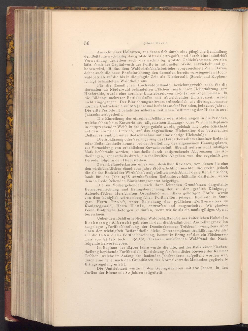 Ueber den höchft erheblichen Waldbefitzftand Seiner kaiferlichen Hoheit des Erzherzogs Albrecht gab eine in dem diefsbezüglichen Ausftellungspavillon ausgelegte„ Forftbefchreibung der Domänekammer Tefchen" wenigftens über einen der wichtigſten Beftandtheile diefes Gütercomplexes Aufklärung. Geftützt auf die Daten diefer Forftbefchreibung, kommt in Bezug auf den ein Flächenausmafs von 87.546 Joch 50.383 Hektaren umfaffenden Waldftand das Nachfolgende hervorzuheben.