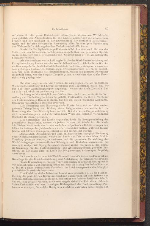 Das Vermeffungs- und Eintheilungswefen, fowie die Ertragsermittlung der preufsifchen Staatsforfte, namentlich jedoch letztere, ift, fobald fich die wirthfchaftlichen Verhältniffe des Staates nach den tiefgreifenden Erfchütterungen desfelben im Anfange des Jahrhundertes wieder confolidirt hatten, während fechzig Jahren, mit feltener Confequenz entwickelt und ausgebildet worden.