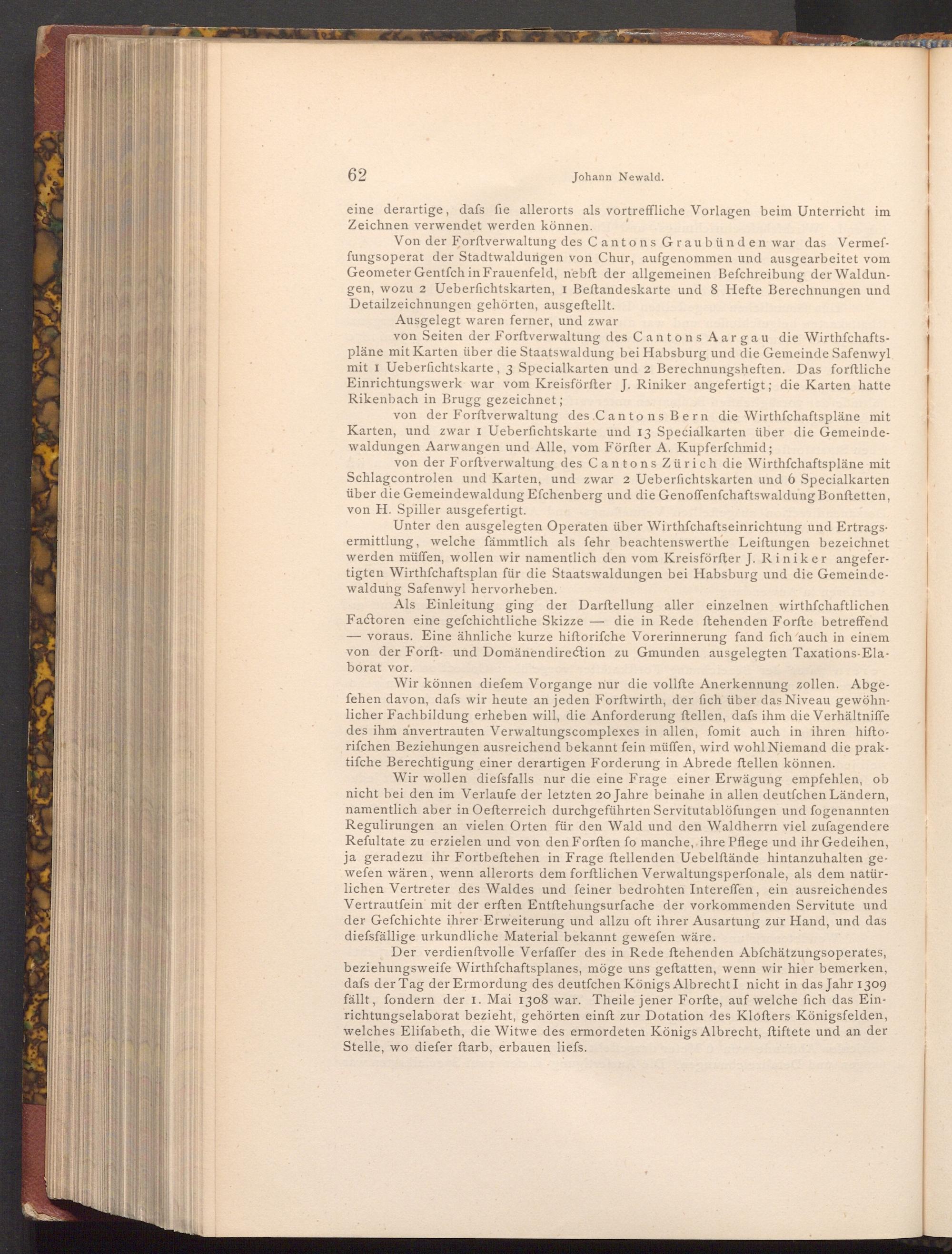 Der verdienftvolle Verfaffer des in Rede ftehenden Abfchätzungsoperates, beziehungsweife Wirthfchaftsplanes, möge uns geftatten, wenn wir hier bemerken, dafs der Tag der Ermordung des deutfchen Königs Albrecht I nicht in das Jahr 1309 fällt, fondern der 1. Mai 1308 war. Theile jener Forfte, auf welche fich das Einrichtungselaborat bezieht, gehörten einft zur Dotation des Klofters Königsfelden, welches Elifabeth, die Witwe des ermordeten Königs Albrecht, ftiftete und an der Stelle, wo diefer ftarb, erbauen liefs.