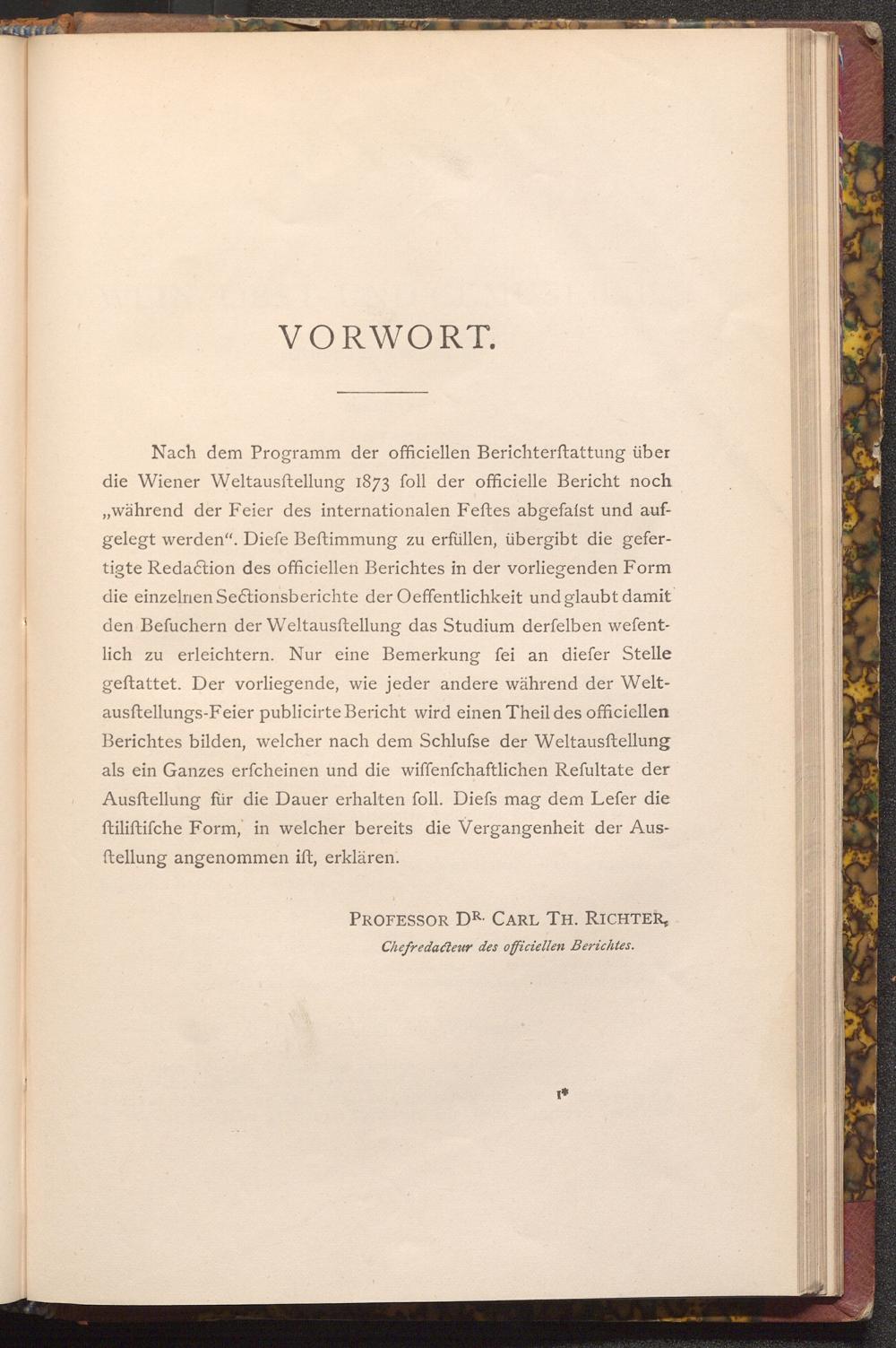 Nach dem Programm der officiellen Berichterstattung über die Wiener Weltausstellung 1873 foll der officielle Bericht noch , während der Feier des internationalen Feftes abgefaist und aufgelegt werden". Diefe Beftimmung zu erfüllen, übergibt die gefertigte Redaction des officiellen Berichtes in der vorliegenden Form die einzelnen Sectionsberichte der Oeffentlichkeit und glaubt damit den Befuchern der Weltausftellung das Studium derfelben wefentlich zu erleichtern. Nur eine Bemerkung fei an diefer Stelle geftattet. Der vorliegende, wie jeder andere während der Weltausftellungs- Feier publicirte Bericht wird einen Theil des officiellen Berichtes bilden, welcher nach dem Schlufse der Weltausftellung als ein Ganzes erfcheinen und die wiffenfchaftlichen Refultate der Ausftellung für die Dauer erhalten foll. Diefs mag dem Lefer die ftiliftifche Form, in welcher bereits die Vergangenheit der Ausftellung angenommen ift, erklären.