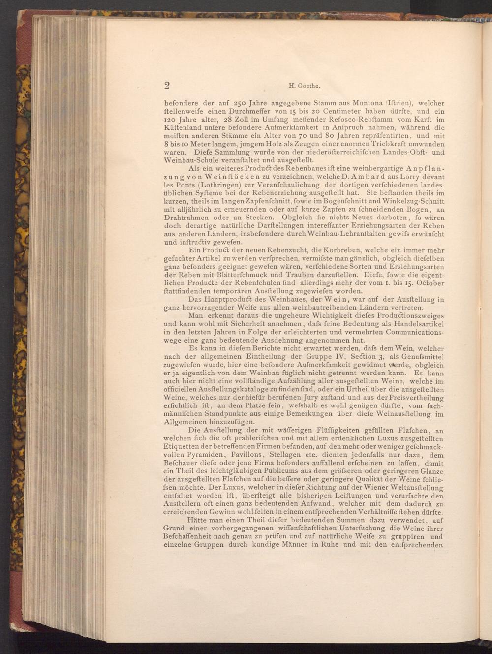 Es kann in diefem Berichte nicht erwartet werden, dafs dem Wein, welcher nach der allgemeinen Eintheilung der Gruppe IV, Section 3, als Genufsmittel zugewiefen wurde, hier eine befondere Aufmerkſamkeit gewidmet werde, obgleich er ja eigentlich von dem Weinbau füglich nicht getrennt werden kann. Es kann auch hier nicht eine vollſtändige Aufzählung aller ausgeftellten Weine, welche im officiellen Ausftellungskataloge zu finden find, oder ein Urtheil über die ausgeftellten Weine, welches nur der hiefür berufenen Jury zuftand und aus der Preisvertheilung erfichtlich ift, an dem Platze fein, wefshalb es wohl genügen dürfte, vom fachmännifchen Standpunkte aus einige Bemerkungen über diefe Weinausftellung im Allgemeinen hinzuzufügen.