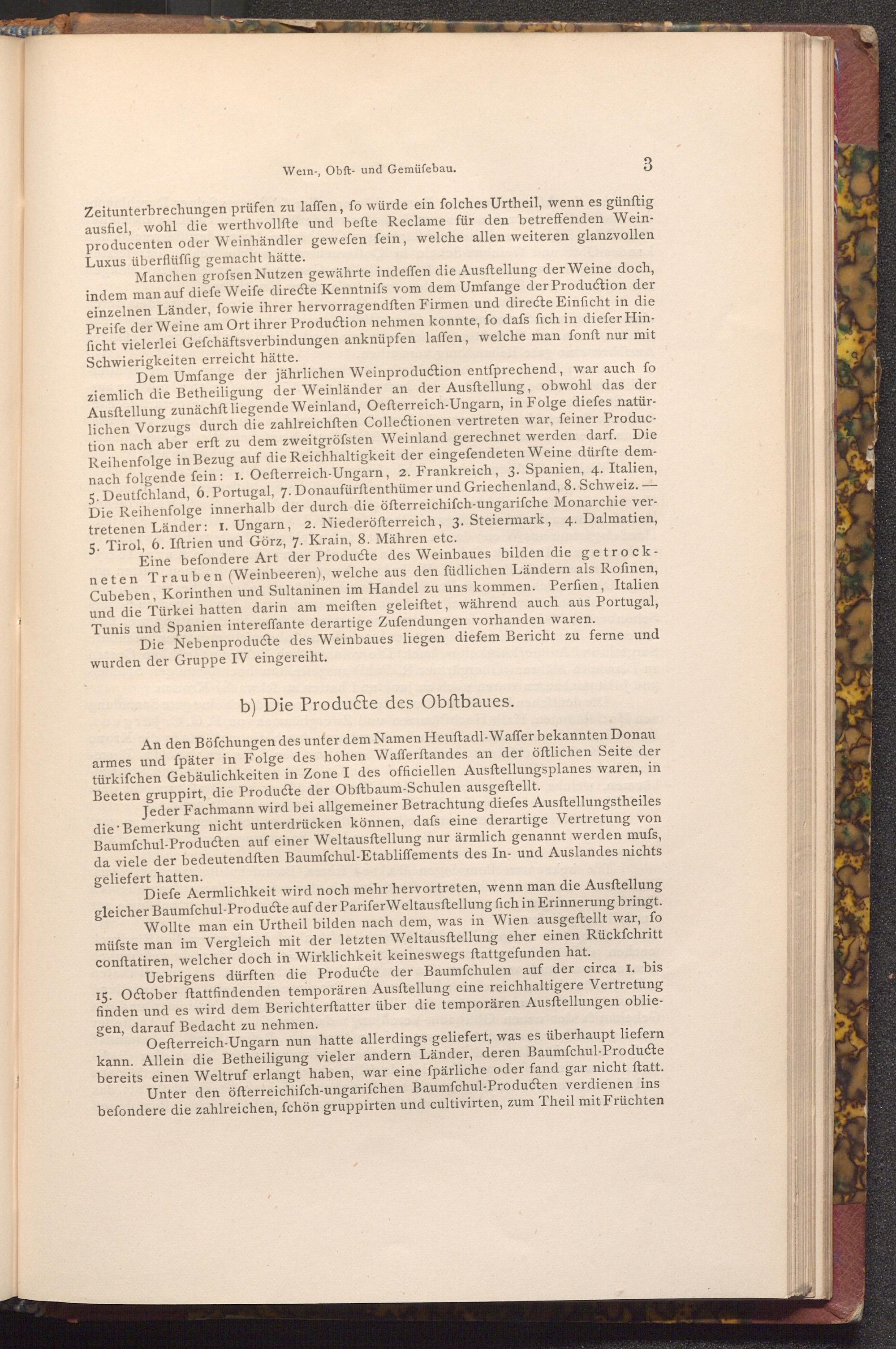 Dem Umfange der jährlichen Weinproduction entſprechend, war auch fo ziemlich die Betheiligung der Weinländer an der Ausftellung, obwohl das der Ausstellung zunächft liegende Weinland, Oefterreich- Ungarn, in Folge diefes natürlichen Vorzugs durch die zahlreichften Collectionen vertreten war, feiner Production nach aber erft zu dem zweitgröfsten Weinland gerechnet werden darf. Die Reihenfolge in Bezug auf die Reichhaltigkeit der eingefendeten Weine dürfte demnach folgende fein: 1. Oefterreich- Ungarn, 2. Frankreich, 3. Spanien, 4. Italien, 5. Deutfchland, 6. Portugal, 7. Donaufürftenthümer und Griechenland, 8. Schweiz.Die Reihenfolge innerhalb der durch die öfterreichiſch- ungarifche Monarchie vertretenen Länder: 1. Ungarn, 2. Niederöfterreich, 3. Steiermark, 4. Dalmatien, 5. Tirol, 6. Iftrien und Görz, 7. Krain, 8. Mähren etc.