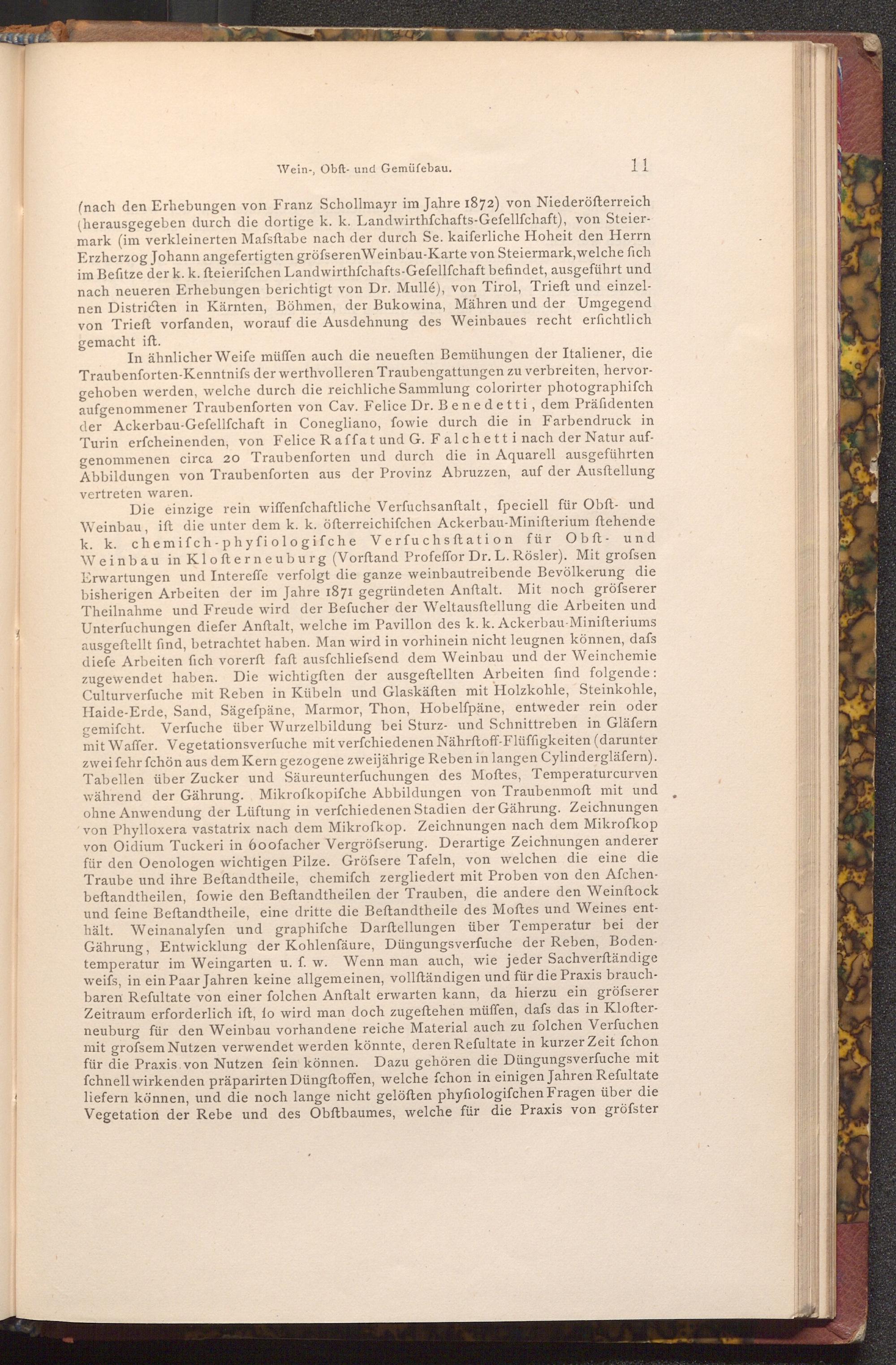 Die einzige rein wiffenfchaftliche Verfuchsanftalt, fpeciell für Obft- und Weinbau, ift die unter dem k. k. öfterreichifchen Ackerbau- Minifterium ftehende k. k. chemifch- phyfiologifche Verfuchsftation für Obft- und Weinbau in Klofterneuburg( Vorftand Profeffor Dr. L. Rösler). Mit grofsen Erwartungen und Intereffe verfolgt die ganze weinbautreibende Bevölkerung die bisherigen Arbeiten der im Jahre 1871 gegründeten Anftalt. Mit noch grösserer Theilnahme und Freude wird der Befucher der Weltausftellung die Arbeiten und Unterfuchungen diefer Anftalt, welche im Pavillon des k. k. Ackerbau- Minifteriums ausgeftellt find, betrachtet haben. Man wird in vorhinein nicht leugnen können, dafs diefe Arbeiten fich vorerft faft ausfchliefsend dem Weinbau und der Weinchemie zugewendet haben. Die wichtigften der ausgeftellten Arbeiten find folgende: Culturverfuche mit Reben in Kübeln und Glaskäften mit Holzkohle, Steinkohle, Haide- Erde, Sand, Sägefpäne, Marmor, Thon, Hobelfpäne, entweder rein oder gemifcht. Verfuche über Wurzelbildung bei Sturz- und Schnittreben in Gläfern mit Waffer. Vegetationsverfuche mit verfchiedenen Nährstoff- Flüffigkeiten( darunter zwei fehr fchön aus dem Kern gezogene zweijährige Reben in langen Cylindergläfern). Tabellen über Zucker und Säureunterfuchungen des Moftes, Temperaturcurven während der Gährung. Mikrofkopifche Abbildungen von Traubenmoft mit und ohne Anwendung der Lüftung in verfchiedenen Stadien der Gährung. Zeichnungen von Phylloxera vastatrix nach dem Mikrofkop. Zeichnungen nach dem Mikrofkop von Oidium Tuckeri in 600facher Vergröfserung. Derartige Zeichnungen anderer für den Oenologen wichtigen Pilze. Gröfsere Tafeln, von welchen die eine die Traube und ihre Beftandtheile, chemifch zergliedert mit Proben von den Afchenbeftandtheilen, fowie den Beftandtheilen der Trauben, die andere den Weinstock und feine Beftandtheile, eine dritte die Beftandtheile des Moftes und Weines enthält.