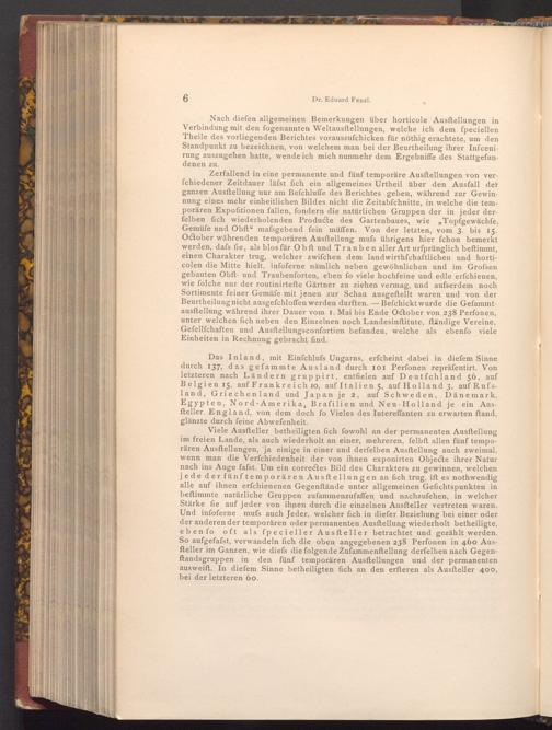 Zerfallend in eine permanente und fünf temporäre Ausftellungen von verfchiedener Zeitdauer läfst fich ein allgemeines Urtheil über den Ausfall der ganzen Ausftellung nur am Befchluffe des Berichtes geben, während zur Gewinnung eines mehr einheitlichen Bildes nicht die Zeitabfchnitte, in welche die temporären Expofitionen fallen, fondern die natürlichen Gruppen der in jeder derfelben fich wiederholenden Producte des Gartenbaues, wie„ Topfgewächfe, Gemüfe und Obft" mafsgebend fein müffen. Von der letzten, vom 3. bis 15. October währenden temporären Ausftellung mufs übrigens hier fchon bemerkt werden, dafs fie, als blos für Obft und Trauben aller Art urfprünglich beftimmt, einen Charakter trug, welcher zwifchen dem landwirthschaftlichen und horticolen die Mitte hielt, infoferne nämlich neben gewöhnlichen und im Grofsen gebauten Obft- und Traubenforten, eben fo viele hochfeine und edle erfchienen, wie folche nur der routinirtefte Gärtner zu ziehen vermag, und aufserdem noch Sortimente feiner Gemüfe mit jenen zur Schau ausgeftellt waren und von der Beurtheilung nicht ausgefchloffen werden durften.- Befchickt wurde die Gefammtausftellung während ihrer Dauer vom 1. Mai bis Ende October von 238 Perfonen, unter welchen fich neben den Einzelnen noch Landesinftitute, ftändige Vereine, Gefellſchaften und Ausstellungsconfortien befanden, welche als ebenso viele Einheiten in Rechnung gebracht find.