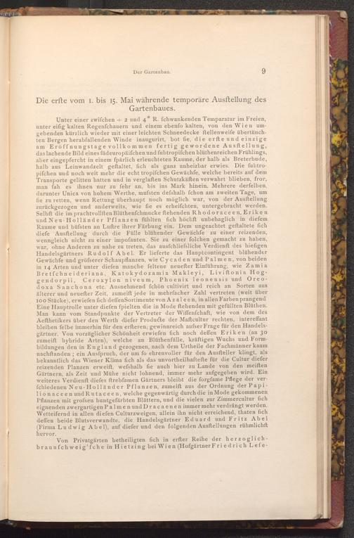 Unter einer zwifchen+ 2 und 4° R. fchwankenden Temparatur im Freien, unter eifig kalten Regenfchauern und einem ebenfo kalten, von den Wien umgebenden kürzlich wieder mit einer leichten Schneedecke ftellenweife übertünchten Bergen herabfallenden Winde inaugurirt, bot fie, die erfte und einzige am Eröffnungstage vollkommen fertig gewordene Ausftellung, das lachende Bild eines füdeuropäifchen und fubtropifchen blüthenreichen Frühlings, aber eingepfercht in einem fpärlich erleuchteten Raume, der halb als Breterbude, halb aus Leinwandzelt geftaltet, fich als ganz unheizbar erwies. Die fubtropifchen und noch weit mehr die echt tropifchen Gewächfe, welche bereits auf dem Transporte gelitten hatten und in verglaften Schutzkäften verwahrt blieben, fror, man fah es ihnen nur zu fehr an, bis ins Mark hinein. Mehrere derfelben, darunter Unica von hohem Werthe, mufsten defshalb fchon am zweiten Tage, um fie zu retten, wenn Rettung überhaupt noch möglich war, von der Ausstellung zurückgezogen und anderweits, wie fie es erheifchten, untergebracht werden. Selbft die im prachtvollften Blüthenfchmucke ftehenden Rhodoraceen, Eriken und Neu- Holländer Pflanzen fühlten fich höchft unbehaglich in diefem Raume und büfsten an Luftre ihrer Färbung ein. Dem ungeachtet geftaltete fich diefe Ausftellung durch die Fülle blühender Gewächfe zu einer reizenden, wenngleich nicht zu einer impofanten. Sie zu einer folchen gemacht zu haben, war, ohne Anderen zu nahe zu treten, das ausfchliefsliche Verdienft des hiefigen Handelsgärtners Rudolf Abel. Er lieferte das Haupt contingent blühender Gewächfe und gröfserer Schaupflanzen, wie Cycaden und Palmen, von beiden in 14 Arten und unter diefen manche feltene neuefter Einführung, wie Zamia Bretfchneideriana, Katokydozamia Makleyi, Liviftonia Hoggendorpii, Ceroxylon niveum, Phoenix leonensis und Oreodoxa Sanchona etc. Ausnehmend fchön cultivirt und reich an Sorten aus älterer und neuefter Zeit, zumeift jede in mehrfacher Zahl vertreten( weit über 100 Stücke), erwiefen fich deffen Sortimente von Azaleen, in allen Farben prangend Eine Hauptrolle unter diefen fpielten die in Mode ftehenden mit gefüllten Blüthen. Man kann vom Standpunkte der Vertreter der Wiffenfchaft, wie von dem des Aefthetikers über den Werth diefer Producte der Maftcultur rechten, intereffant bleiben felbe immerhin für den erfteren, gewinnreich aufser Frage für den Handelsgärtner. Von vorzüglicher Schönheit erwiefen fich noch deffen Eriken( an 30 zumeift hybride Arten), welche an Blüthenfülle, kräftigen Wuchs und Formbildungen den in England gezogenen, nach dem Urtheile der Fachmänner kaum nachftanden; ein Ausfpruch, der um fo ehrenvoller für den Aussteller klingt, als bekanntlich das Wiener Klima fich als das unvortheilhaftefte für die Cultur diefer reizenden Planzen erweift, wefshalb fie auch hier zu Lande von den meiften Gärtnern, als Zeit und Mühe nicht lohnend, immer mehr aufgegeben wird. Ein weiteres Verdienft diefes ftrebfamen Gärtners bleibt die forgfame Pflege der verfchiedenen Neu- Holländer Pflanzen, zumeift aus der Ordnung der Papilionace en und Rutaceen, welche gegenwärtig durch die in Mode gekommenen Pflanzen mit grofsen buntgefärbten Blättern, und die vielen zur Zimmercultur fich eignenden zwergartigen Palmen und Dracaenen immer mehr verdrängt werden. Wetteifernd in allen diefen Culturzweigen, allein ihn nicht erreichend, thaten fich deffen beide Blutsverwandte, die Handelsgärtner Eduard und Fritz Abel ( Firma Ludwig Abel), auf diefer und den folgenden Ausftellungen rühmlichft hervor.
