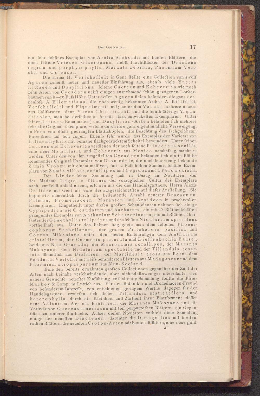 Die Firma H. Verfchaffelt in Gent ftellte eine Collection von zwölf Agaven zumeift neuer und neuefter Einführung aus, eben fo viele Yuccas Littaeen und Dasylirions, feltene Cacteen und Echeverien wie noch zehn Arten von Cycadeen nebft einigen ausnehmend fchön gezogenen Lorberbäumen von 6-10 Fufs Höhe. Unter deffen Agaven fielen befonders die ganz dornenlofe A. Ellemetiana, die noch wenig bekannten Arten: A. Killifchi, Verfchaffelti und Fiquelmonti auf; unter den Yuccas mehrere neuere aus Californien, dann Yucca Ghiesbrechti und die buntblätterige Y. quadricolor, manche derfelben in bereits ftark entwickelten Exemplaren. Unter feinen Litta e a-( Bonapartea) und Dasylirion- Arten befanden fich mehrere fehr alte Original- Exemplare, welche durch ihre ganz eigenthümliche Verzweigung. in Form von dicht gedrängten Blattfchöpfen, die Beachtung des fachgelehrten Botanikers auf fich zogen. Ebenfo fehr wurde das Exemplar der Varietät von Littaea hyftrix mit beinahe flachgedrücktem Scheitel bewundert. Unter feinen Cacteen und Echeverien verdienen der noch feltene Pilocereus senilis, eine neue Mamillaria und Echeveria aus Mexico namhaft gemacht zu werden. Unter den von ihm ausgeftellten Cycadeen befanden fich ein in Blüthe kommendes Original Exemplar von Dion edule, die noch fehr wenig bekannte Zamia Vro o mi mit einem maffiven, faft 2 Fufs hohen Stamme, fchöne Exemplare von Zamia villosa, corallipes und Lepidozamia Perowskiana. Der Linden'fchen Sammlung fich in Bezug an Novitäten, der der Madame Legrelle d'Hanis der vorzüglichen Cultur der Exemplare nach, zunächft anfchliefsend, erfchien uns die des Handelsgärtneлs, Herrn Alexis Dallière aus Gent als eine der ausgezeichnetften auf diefer Ausftellung. Sie imponirte namentlich durch die bedeutende Anzahl neuerer Dracaenen, Palmen, Bromeliace en, Maranten und Aroideen in prachtvollen Exemplaren. Eingetheilt unter diefen grofsen Schaupflanzen nahmen fich einige Cypripedien wie C. caudatum und barbatum, ein mit 18 Blüthenfchäften prangendes Exemplar von Anthurium Scherzerianum, ein mit Blüthen überfäetes der Genethyllis tulipifera und das fchöne Nidularium splendens vortheilhaft aus. Unter den Palmen begegnete man dem feltenen Phoenicophorum Sechellarum, der grofsen Pritchardia pacifica und Coccos Mikaniana; unter den neuen Einführungen dem Anthurium cristallinum, der Curmeria picturata und Dieffenbachia Bausei, beide aus Neu Granada; der Macrozamia corallipes, der Maranta Makoyana, dem Nidularium spectabile und der Tillandsia tesselata fämmtlich aus Brafilien; der Martinezia erosa aus Peru; dem Pandanus Veitchii mit weifs beränderten Blättern aus Madagascar und dem Phormium atropurpureum aus Neu- Seeland.
