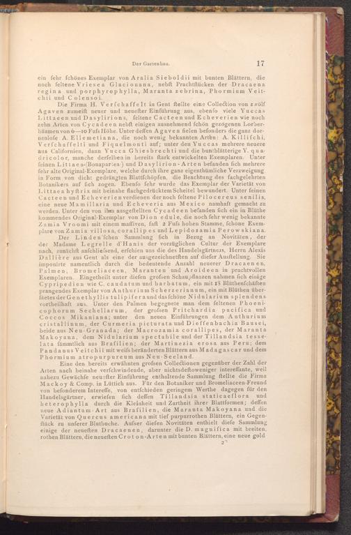 Eine den bereits erwähnten grofsen Collectionen gegenüber der Zahl der Arten nach beinahe verfchwindende, aber nichtsdeftoweniger intereffante, weil nahezu Gewächfe neuefter Einführung enthaltende Sammlung ftellte die Firma Mackoy& Comp. in Lüttich aus. Für den Botaniker und Bromeliaceen- Freund von befonderem Intereffe, von entfchieden geringem Werthe dagegen für den Handelsgärtner, erwiefen fich deffen Tillandsia staticaeflora heterophylla durch die Kleinheit und Zartheit ihrer Blattformen; deffen neue Adiantum Art aus Brafilien, die Maranta Makoyana und die Varietät von Quercus americana mit tief purpurrothen Blättern, ein Gegenftück zu unferer Blutbuche. Aufser diefen Novitäten enthielt diefe Sammlung einige der neueften Dracaenen, darunter die D. magnifica mit breiten, rothen Blättern, die neueften Croton- Arten mit bunten Blättern, eine neue gold