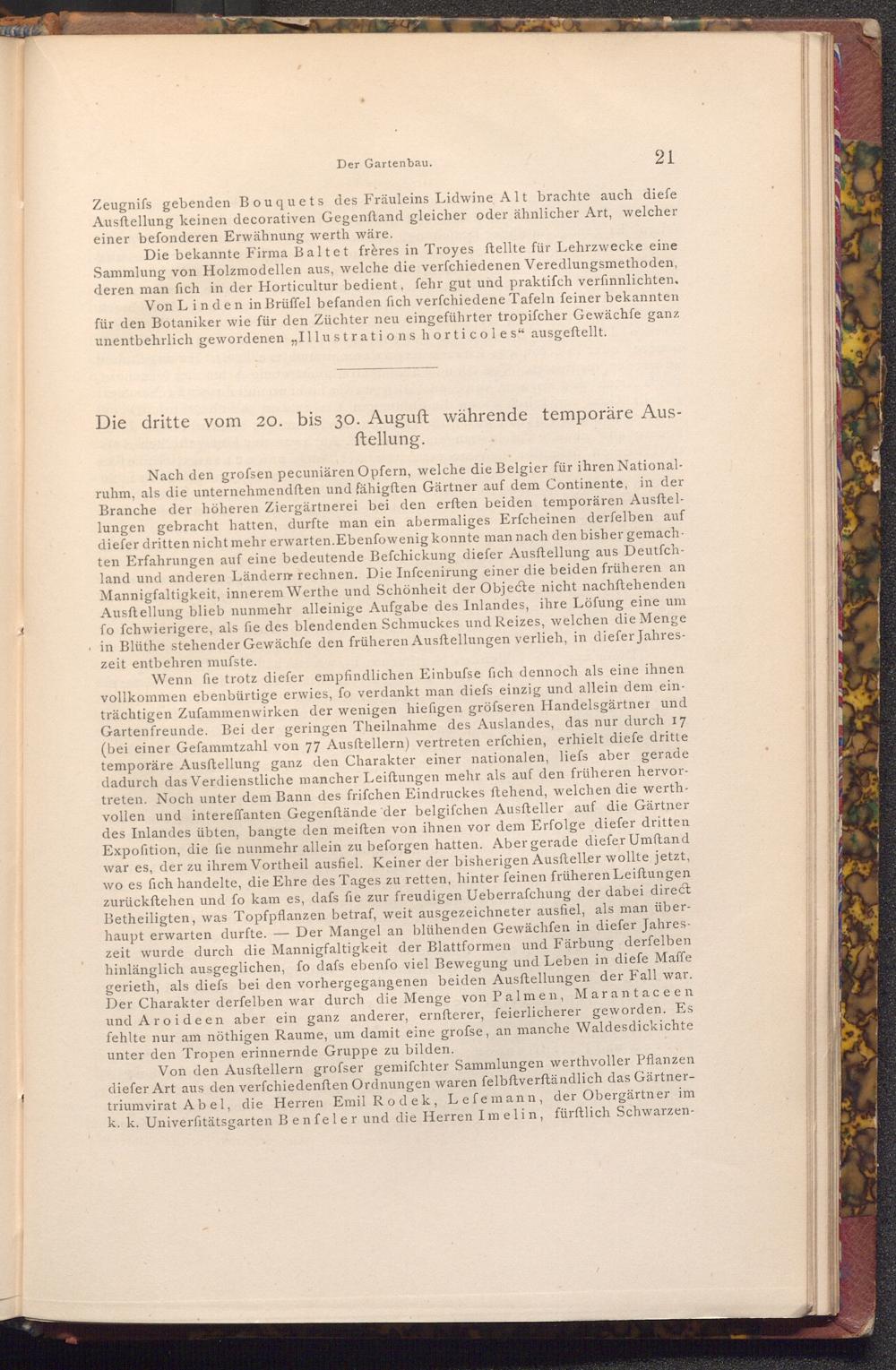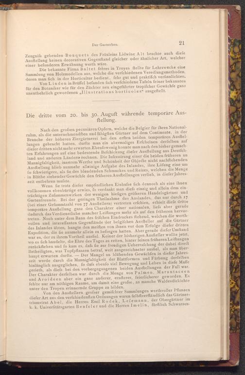 Von den Ausftellern grofser gemifchter Sammlungen werthvoller Pflanzen diefer Art aus den verfchiedenften Ordnungen waren felbftverſtändlich das Gärtnertriumvirat Abel, die Herren Emil Rodek, Lefemann, der Obergärtner im k. k. Univerfitätsgarten Benfeler und die Herren Imelin, fürftlich Schwarzen