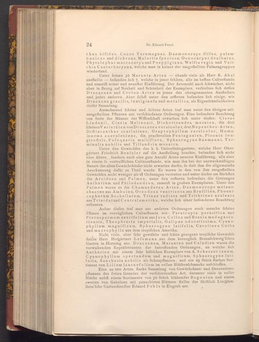Unter den Gewächfen des k. k. Univerfitätsgartens, welche Herr Obergärtner Friedrich Benfeler auf die Ausftellung brachte, befanden fich nicht blos ältere, fondern auch eine gute Anzahl Arten neuerer Einführung, alle aber in einem fo vortrefflichen Culturzuftande, wie man ihn bei der unzweckmäfsigen Bauart der alten Gewächshäufer nicht erwarten durfte, fo dafs ihm die allgemeinfte Anerkennung dafür zu Theil wurde. Es waren in den von ihm ausgeftellten Gewächfen nicht weniger als 18 Ordnungen vertreten und unter diefen am ftärksten die Aroideen und Palmen, unter den erfteren befonders die Gattungen Anthurium und Philodendron, zumeift in grofsen Exemplaren. Unter den Palmen waren es die Chamaedorea- Arten, Daemonorops melanochaetus aus Amboina, Oreodoxa ventricosa aus Brafilien, Phoenicophorum Sechellarum, Trinax radiata und Trithrinax aculeata aus Trinidatund Centralamerika, welche fich einer befonderen Beachtung erfreuten.