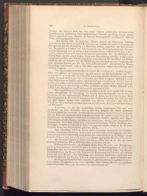 Von Einzelpflanzen ftellte Herr Leopold Miltfchinsky, gräflich Eggerfcher Obergärtner in Lippitzbach aus Kärnten, ein Riefenexemplar von Philodendron pertusum in reifen fehr wohlfchmeckenden Früchten nebft einem ebenfo fchönen von Cycas revoluta aus, und Herr Lagler, fürftlich Claryfcher Hofgärtner in Teplitz, eines von Curculigo recurvata foliis variegatis, ein wahres viel bewundertes Prachtexemplar, endlich Herr Handelsgärtner Lucas Bachraty aus Liefing bei Wien 24 Stücke in voller Blüthe ftehende 4 bis 5 Fufs hohe Exemplare von Campanula pyramidalis.