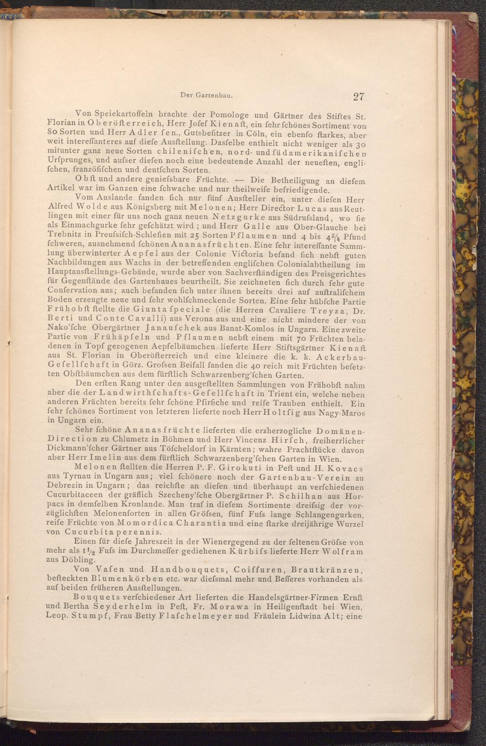 Bouquets verfchiedener Art lieferten die Handelsgärtner- Firmen Ernft und Bertha Seyderhelm in Peft, Fr. Morawa in Heiligenftadt bei Wien, Leop. Stumpf, Frau Betty Flafchelmeyer und Fräulein Lidwina Alt; eine