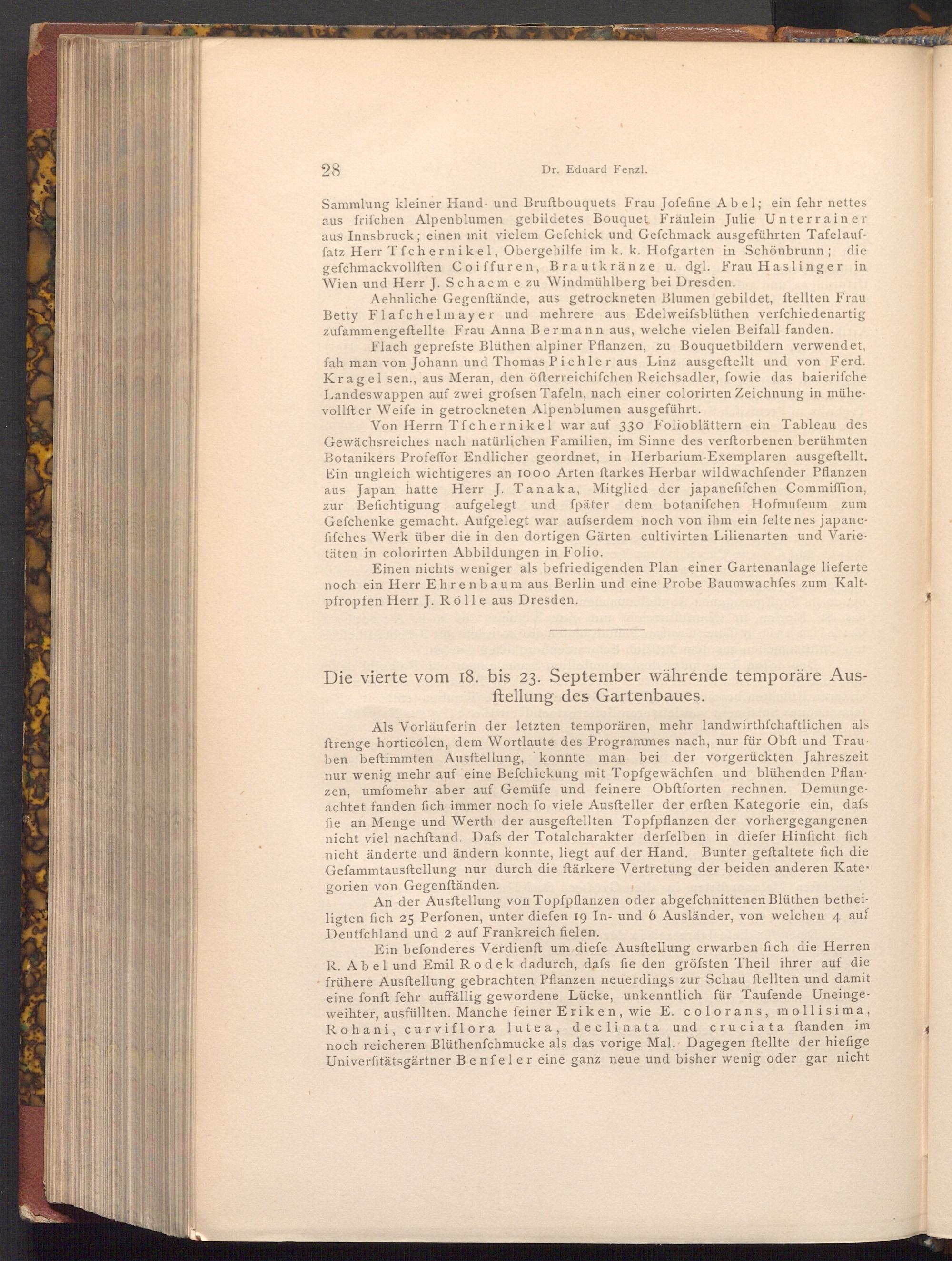 Ein befonderes Verdienft um diefe Ausftellung erwarben fich die Herren R. Abel und Emil Rodek dadurch, dafs fie den gröfsten Theil ihrer auf die frühere Ausftellung gebrachten Pflanzen neuerdings zur Schau ftellten und damit eine fonft fehr auffällig gewordene Lücke, unkenntlich für Taufende Uneingeweihter, ausfüllten. Manche feiner Eriken, wie E. colorans, mollisima, Rohani, curviflora lutea, declinata und cruciata ftanden im noch reicheren Blüthenfchmucke als das vorige Mal. Dagegen ftellte der hiefige Univerfitätsgärtner Benfeler eine ganz neue und bisher wenig oder gar nicht