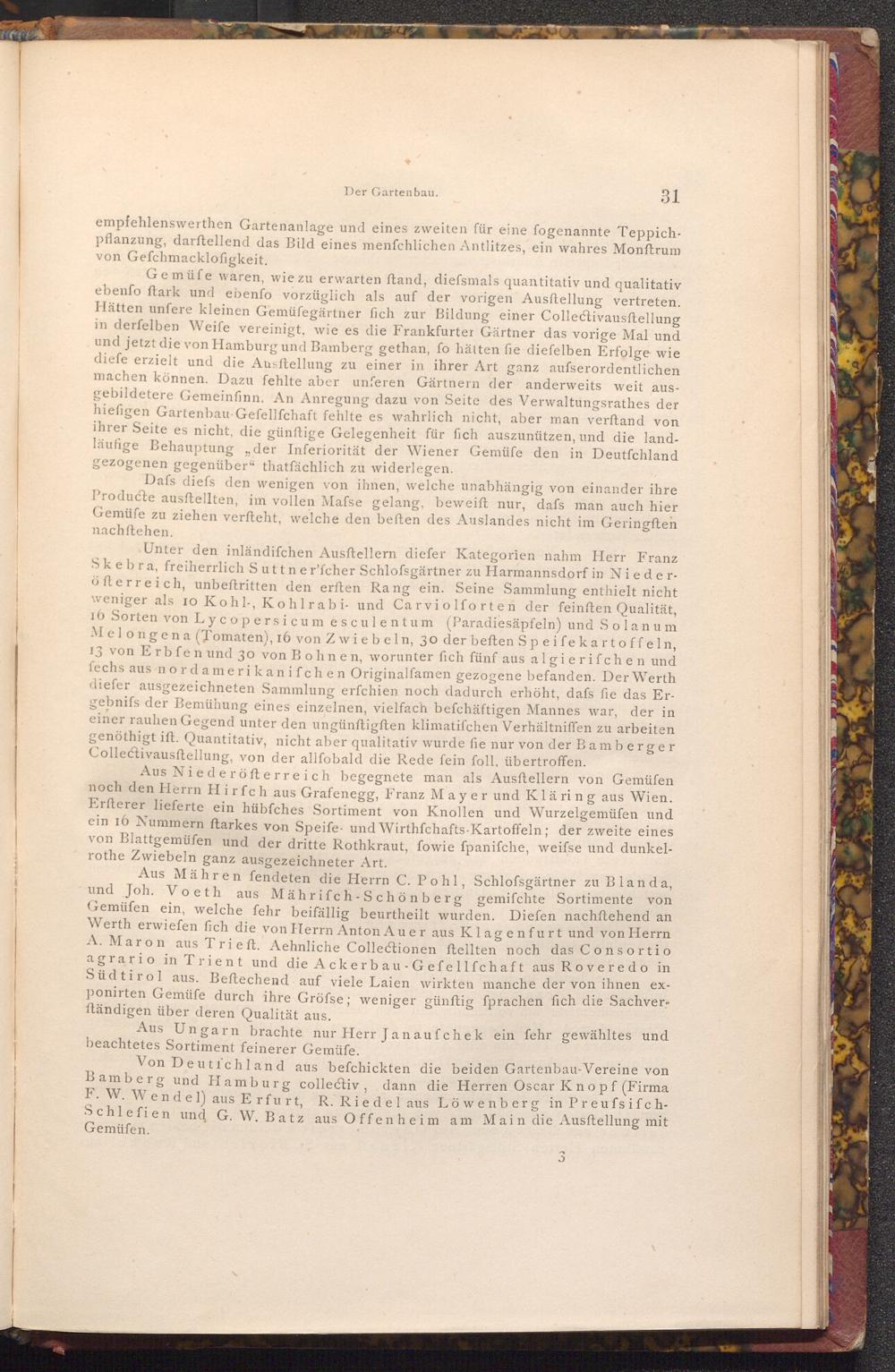 Gemüfe waren, wie zu erwarten ftand, diefsmals quantitativ und qualitativ ebenfo ftark und ebenfo vorzüglich als auf der vorigen Ausstellung vertreten. Hätten unfere kleinen Gemüfegärtner fich zur Bildung einer Collectivausftellung in derfelben Weife vereinigt, wie es die Frankfurter Gärtner das vorige Mal und und jetzt die von Hamburg und Bamberg gethan, fo hätten fie diefelben Erfolge wie diefe erzielt und die Ausftellung zu einer in ihrer Art ganz aufserordentlichen machen können. Dazu fehlte aber unferen Gärtnern der anderweits weit ausgebildetere Gemeinfinn. An Anregung dazu von Seite des Verwaltungsrathes der hiefigen Gartenbau- Gefellfchaft fehlte es wahrlich nicht, aber man verftand von ihrer Seite es nicht, die günftige Gelegenheit für fich auszunützen, und die landläufige Behauptung der Inferiorität der Wiener Gemüſe den in Deutfchland gezogenen gegenüber" thatfächlich zu widerlegen.