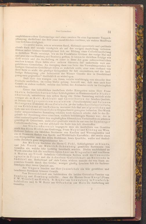 Von Deutichland aus befchickten die beiden Gartenbau- Vereine von Bamberg und Hamburg collectiv, dann die Herren Oscar Knopf( Firma F. W. Wendel) aus Erfurt, R. Riedel aus Löwenberg in PreufsifchSchlefien und G. W. Batz aus Offenheim am Main die Ausftellung mit Gemüfen.