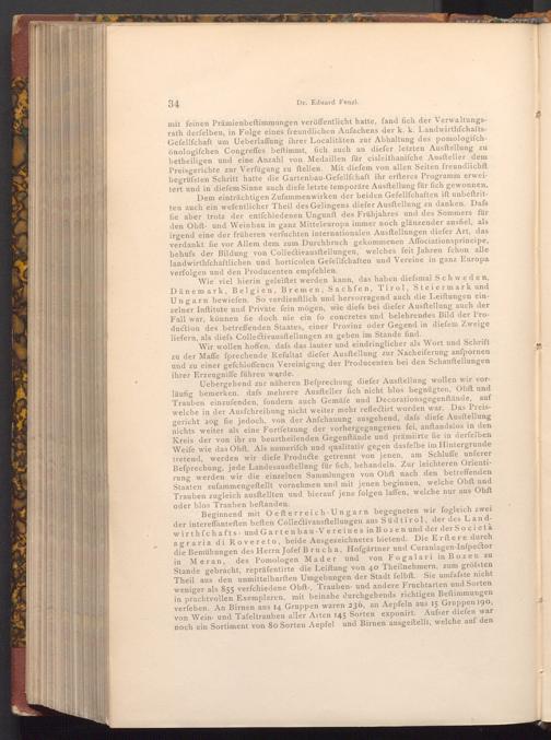 Beginnend mit Oefterreich- Ungarn begegneten wir fogleich zwei der intereffanteften beften Collectivausftellungen aus Südtirol, der des Landwirthfchafts- und Gartenbau- Vereines in Bozen und der der Società agraria di Rovereto, beide Ausgezeichnetes bietend. Die Erftere durch die Bemühungen des Herrn Jofef Brucha, Hofgärtner und Curanlagen- Infpector in Meran, des Pomologen Mader und von Fogalari in Bozen zu Stande gebracht, repräfentirte die Leiftung von 40 Theilnehmern, zum gröfsten Theil aus den unmittelbarften Umgebungen der Stadt felbft. Sie umfafste nicht weniger als 855 verfchiedene Obft-, Trauben- und andere Fruchtarten und Sorten in prachtvollen Exemplaren, mit beinahe durchgehends richtigen Beftimmungen verfehen. An Birnen aus 14 Gruppen waren 236, an Aepfeln aus 15 Gruppen 190, von Wein- und Tafeltrauben aller Arten 145 Sorten exponirt. Aufser diefen war noch ein Sortiment von 80 Sorten Aepfel und Birnen ausgeftellt, welche auf den